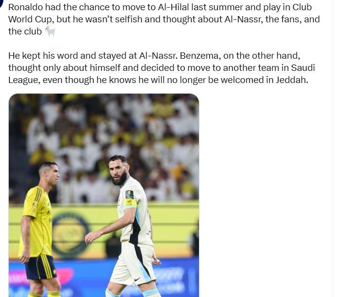 博主:去年夏天,C罗其实有机会转会利雅得新月,并代表新东家出战世俱杯。但他没有选择为自己谋利,而是顾全大局——为了利雅得胜利、为了球迷、也为了自己许下的承诺,他最终选择留下,坚守诺言。 反观本泽马,却只考虑个人利益,在合同期内便决定转投沙特联赛的另一支球队。尽管他心知肚明,这一举动将让他在吉达彻底失去人心,再也无法被当地球迷接纳。