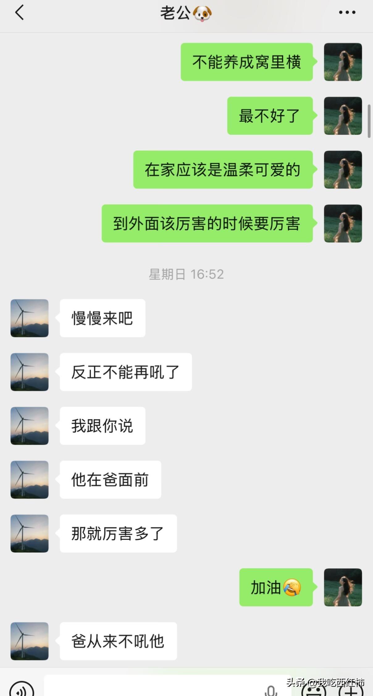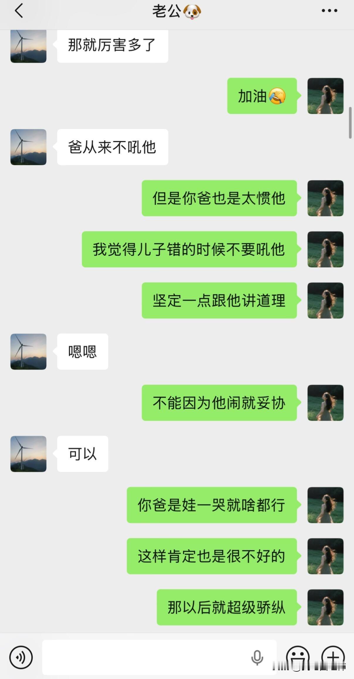 老公说再也不吼孩子了 孩子马上2岁了。周六下午我带孩子午睡,老公在隔壁房间睡。孩子睡了,突然收到老公发来的消息,说不能再吼孩子了,感觉孩子现在胆子越来越小了。 我们一致很认可。当过爸爸妈妈的都知道,孩子在家庭里可能属于下位,男孩子还更加调皮一些,一旦犯错,父母很容易被激怒,有时候甚至习惯性吼孩子,尤其是大声呵斥那种状态,对孩子的成长应该是非常不利的。说实话,我和老公对家人都有点不会好好说话,语气经常比较冲那种,这或许跟自身成长环境有很大关系,我自己就觉得父母在我小的时候不会尊重我。现在我们的孩子,如果对他也继续这样下去,那他以后也会一样…… 意识到问题就要解决问题。从那天聊完,到现在我们都没吼过孩子,当然这过程中孩子也还是会不懂事犯错啊,尽量【坚定且温柔】地告诉他这样不对。我还在努力中……加油…… 我突然想起来之前朋友说她孩子非常窝里横,在家小霸王,出去被其他小朋友欺负了也不敢还击,因为孩子是她一人带的,孩子小的时候经常对她吼叫(我就亲眼见过,当时还觉得很过分),当然好的时候对孩子又超级好,就这样的极端,或许才造就了孩子现在的性格。
