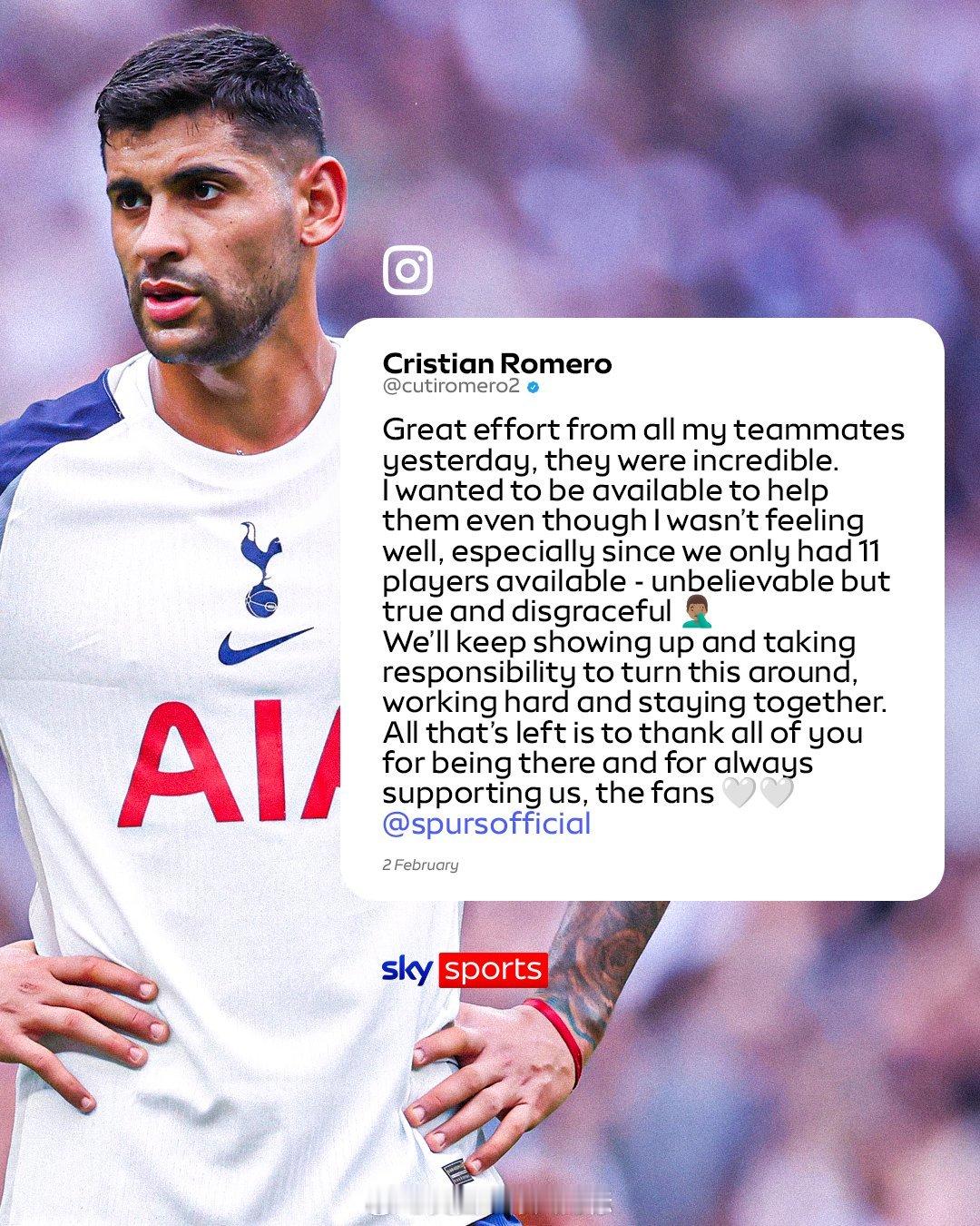 【热刺陷入伤病危机】热刺队长罗梅罗,在个人主页发文,回应上一场比赛(热刺2比2曼城),自己只踢了半场,中场休息被换下的原因: