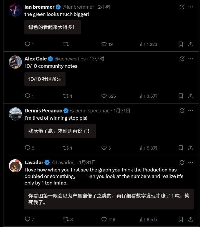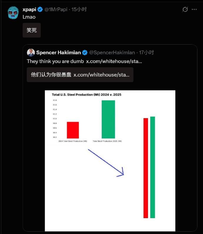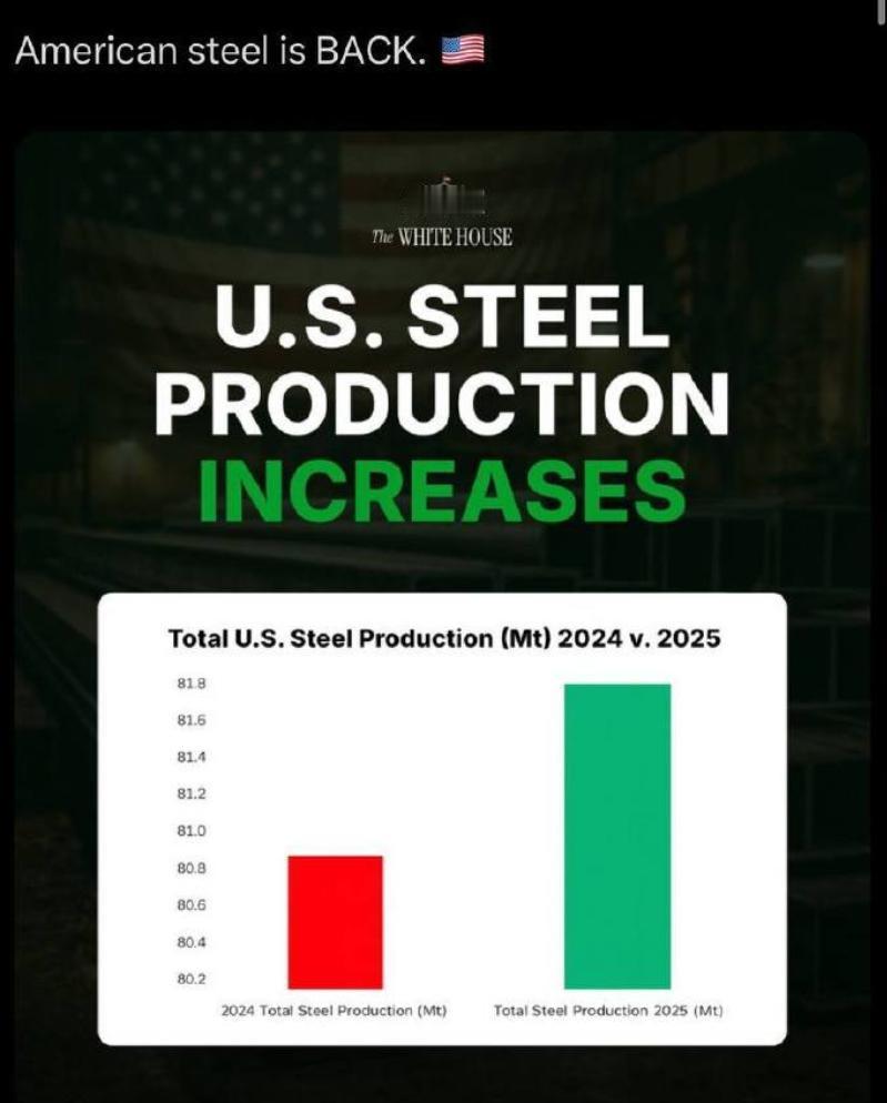 钢产量略微增长,白宫制图吹嘘“钢铁业回来了”,结果“小动作”被网友识破 近日,世界钢铁协会公布了全球主要产钢国的2025年“成绩单”,中国在“收力”的情况下仍以9.6亿吨的产量占据榜首,而日本却失守了世界第三大产钢国的位置,8070吨的产量被美国的8200万吨超过。 对此,特朗普直接发文邀功,称美国能超过日本全要谢谢自己,但事实上,这完全是因为日本自己不争气,2025年的钢产量同比下降了4%,才让美国捡了漏,但对特朗普来说,这肯定是要算自己的“又一项胜利”。 更绝的是,白宫官方发了个柱状图,将2024年和2025年的钢产量加以对比,并吹嘘“美国钢铁业回来了”。 乍一看这张表,给人的感觉是美国的2025年钢产量比前一年翻了一倍,但仔细一看,这表的纵坐标轴起点不是0而是80.2,计量单位更是小到了0.2MT(百万吨),明明只有1%左右的增幅,经白宫这么一搞却变成了100%的增幅,这难道就是所谓的“统计学魅力时刻”? 虽然美国普通民众的数学确实不太好(不少人甚至分不清三分之一和四分之一哪个大),但白宫这么搞,相当于是把全美国人都当傻子糊弄了,所以这个帖子的评论区就“沦陷了”:“认为我们很蠢?”、“我厌倦了赢,别再说了”、“你居然炫耀那1%的增长?”、“绝对的虚假宣传”。 前段时间特朗普上任一周年,白宫发布了特朗普的“365项胜利”,而“美国钢产量超过日本”,绝对会成为今年特朗普“365项胜利”的其中一项,美国或许可以努努力,试试今年的钢产量能不能超过中国唐山,这个含金量可比超越日本高多了。