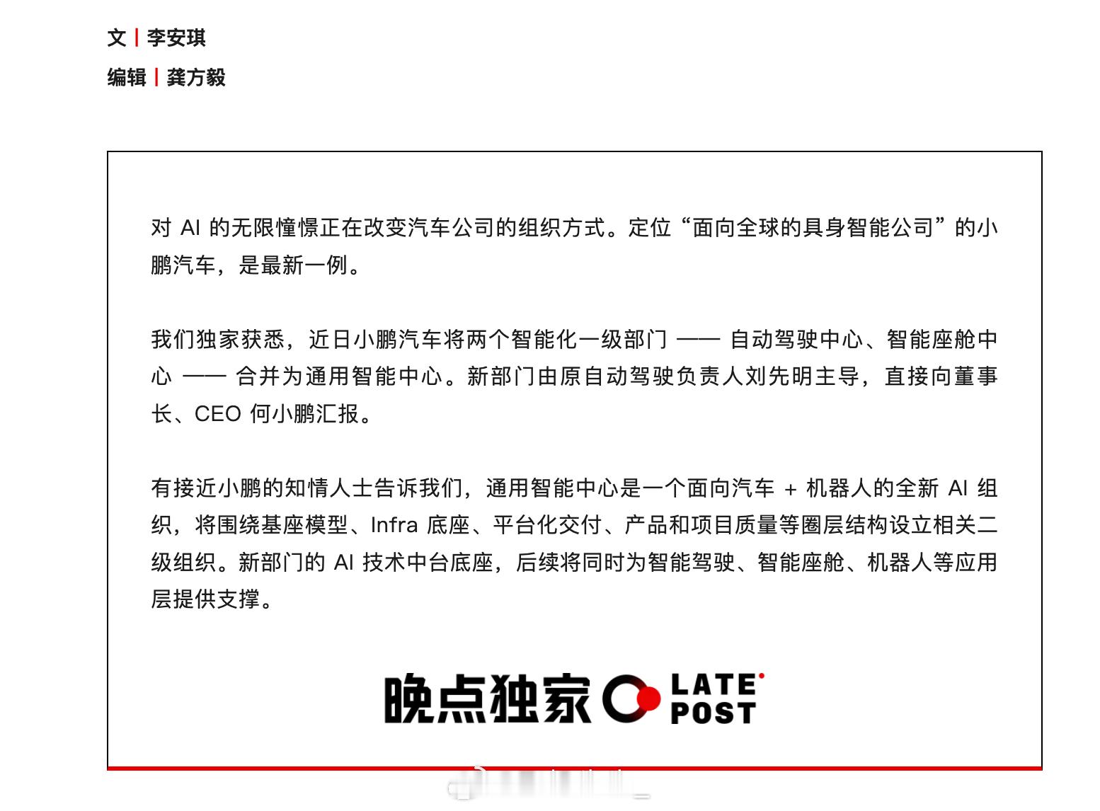 小鹏座舱、智驾两个智能化一级部门合并成一个通用智能中心部门负责人是原自动驾驶负责人刘先明主导向何小鹏汇报
