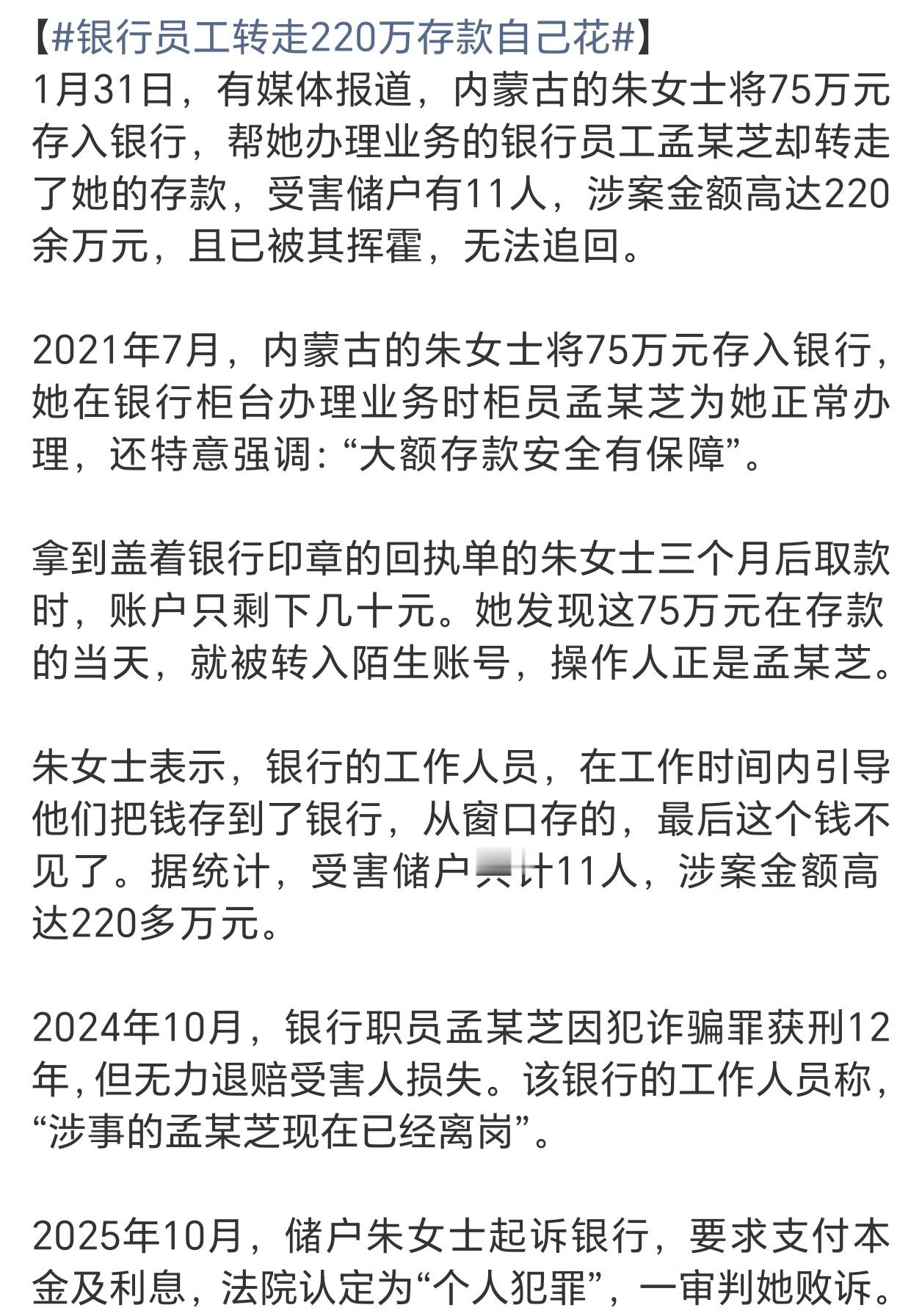 员工转走220万存款银行不愿赔偿这是哪个银行?这做法比古代的镖行还不靠谱,以后谁还敢去存钱?