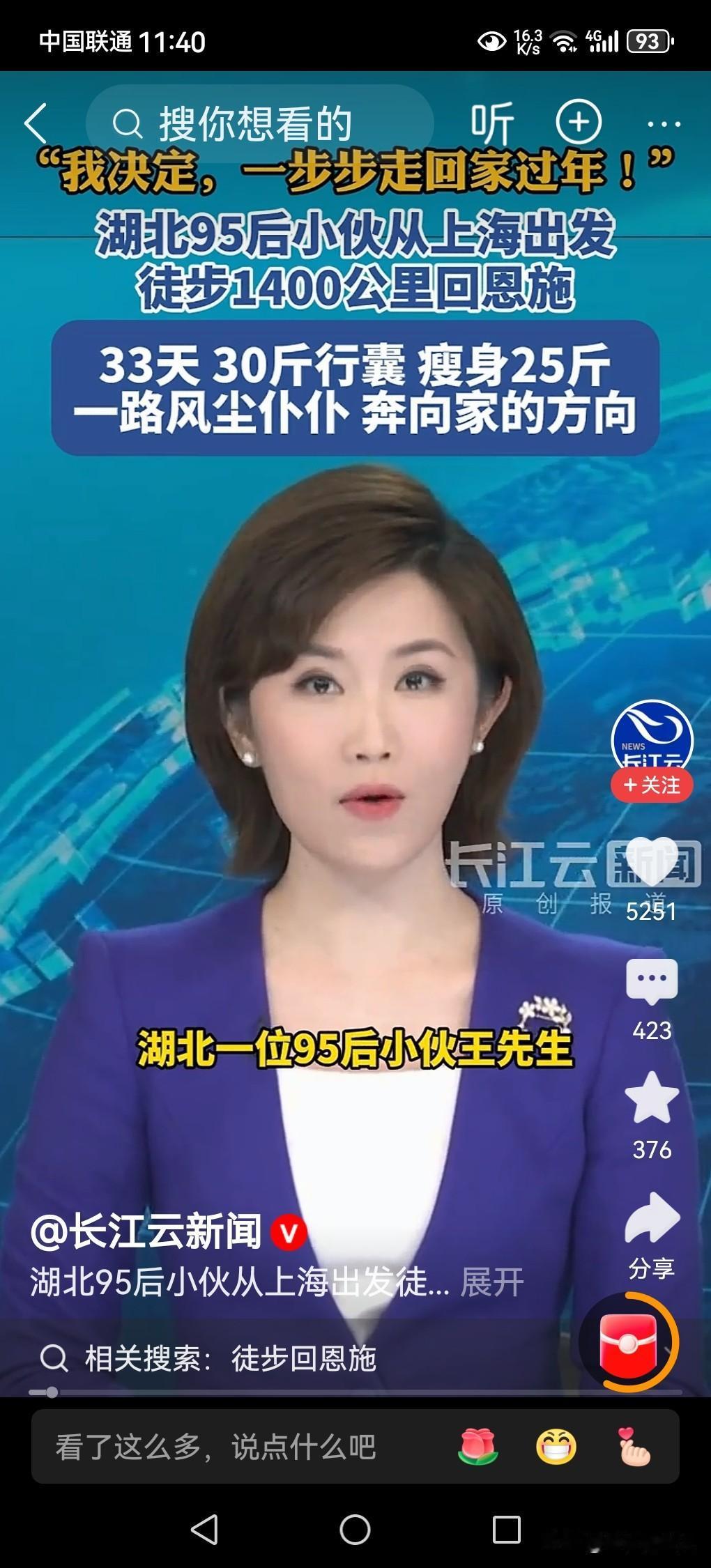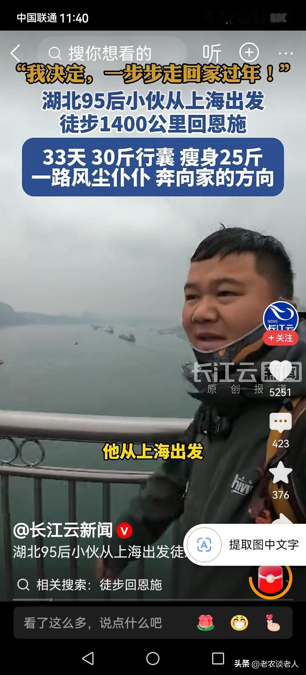 小伙从上海徒步1400公里回湖北恩施老家过年! 很多人身上患上了很多疾病,都是不良的生活习惯所导致的,为了保护自己的身体健康,很多人采取运动的方式,来恢复身体健康,达到保护身体健康的目的,是非常必要的事情。 据媒体2月3日报道,一个出生于1995年的小伙子,因身患胰腺炎,内分泌失调,血脂升高,便采取徒步运动的方式,锻炼和恢复身体健康,从上海徒步1400公里,回到湖北恩施的老家过年。 距离1400公里的路程不是一天两天能够徒步走完的事情,但小伙子非常有毅力,有勇气,有决心,为了自己的身体健康,便带上帐篷和日常生活用品,身背30斤重的背包,从上海出发,沿着回湖北的公路,每天行走30公里,每天一般情况下只吃一餐饭,晚上在路边露营住帐篷,已经穿破了两双鞋,花费了3000多元的日常生活费用,经历了33天,身体消瘦了25斤,终于回到了湖北恩施老家,经医生检查,他的血脂已经恢复正常了,胰腺炎已经治愈了,身体健康基本恢复了正常状态。 本人认为,这位小伙子非常有勇气,有毅力,有决心,能够不怕困难,勇敢面对自己的身体健康状况,勇敢面对眼前徒步的困难重重,勇敢的迈出了通过徒步锻炼身体的勇气,确实让人钦佩,特别是一些中老年人要学习他的那种勇敢的精神。 有很多疾病,都是因为人的工作和生活不良的状态所导致的,为了解决自己的身体健康问题,通过运动锻炼身体,恢复身体健康,不是一个轻而易举就能够做到的事情,必须要付出巨大的艰辛,努力克服困难才能实现的。 特别注意的是,提醒中老年人,在我们的日常生活中,千万不要忽视自己的身体健康,一定要管住好自己的嘴,迈开自己的腿,管控好自己的身体健康,是一项非常重要的日常事务,千万不要掉以轻心,千万要当作一件头等大事来做。 以上是本人观点,如有不妥,请大家在留言区中,留下你宝贵的意见,并积极参与。讨论,特邀请大家关注老人养老问题。