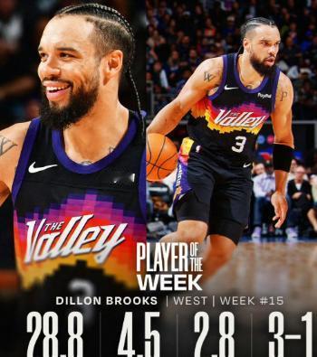 狄龙本赛季算彻底熬出头了! 今天,NBA官方公布了上周东西部周最佳球员,太阳队