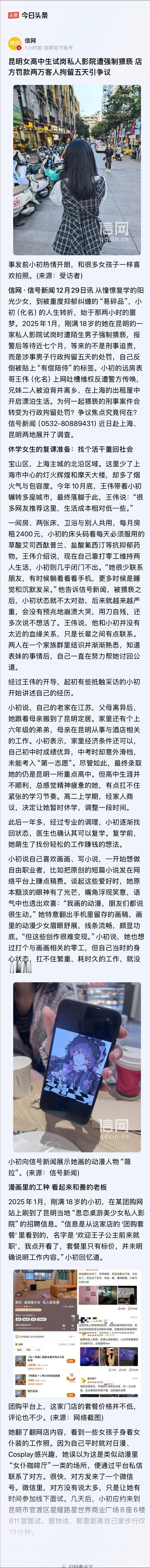 云南昆明,刚满18岁的女高中生想找一份轻松赚钱的工作便到一家私人影院试岗,结果被男顾客强制猥亵2个小时之久。事后,女生报警,5个月后,民警表示女孩是有偿陪侍且是私人影院的员工并没有立案。 女孩不服,多方奔走,警方终于刑事立案,可等了2个月,等来的却是涉事男顾客被拘留5天,自己反倒被贴上“有偿陪侍”的标签的结果。随后,女孩表哥得知后上网吐槽,反被警方以寻衅滋事、泄露警务信息传唤。如今女孩表哥表示,将继续维权为女孩讨回公道,同时提醒年轻人在找工作时一定要提高警惕。 女孩出生在一个普通家庭,父母靠摆摊为生,收入勉强维持一家人的生活支出。 因为体谅父母辛苦,女孩决定趁课余时间找一份兼职挣点零花钱。 她在网上看到一家私人影院发布的招聘信息,附图是一套女仆装,看起来干净可爱。 岗位描述里没有明确写具体做什么,只宣传轻松高薪,时薪达到一百块。 这家影院离女孩家不远,一眼看上去像正规场所,小初心动了,就联系了招聘人。 对方自称叫万哥,语气热情,反复强调正规有保障,还承诺一旦入职就签合同、交社保,甚至能开实习证明。 女孩在影院前台进行了简单面试,反复追问具体内容,对方只说是陪顾客看电影、倒水、聊聊天,提供情绪价值,不会涉及违法的东西。 她虽然有些犹豫,但一想到试岗只是看看,也许根本没事,就答应了当晚上岗。 那天晚上,她被带入包间前,被要求换上一套长裙制服,还以保护顾客隐私为由收走了手机。 进去后,包间门随后从外面反锁了。 屋里是一位成年男子,浑身酒气,看她的眼神很不友善。 一开始,两人还勉强维持着氛围,电影才开始没一会,对方就开始动手动脚。 她试图摆脱,想开门离开,却发现门根本打不开。 她拼命呼救,喊得嗓子都哑了,敲门敲到手疼,也没人理她。 途中包间门曾被打开,她以为有人来救她,结果门外正是万哥。 她向他喊叫请他帮忙,但他只看了几眼又冷冷关上门,留下她继续面对猥亵。 两个小时里,她几次挣扎,几次求饶,对方毫无收敛。 直到那名顾客自行离开,小初才被放出包间。 她披头散发推开门冲出去,只想赶快逃离这片黑暗。 但万哥拦住了她,要她加顾客的社交账号,还用她手机强行确认收款640元。 她抗拒,被威胁称他认识派出所的人,还掌握她家所有资料,敢报警就有她好看。 回家之后她一夜未眠,决定要告发这些人。 她连夜报了警,想着警察能为她讨一个说法。 可接下来的日子里,等待她的是一次次被“再补证据”的敷衍回应。 整整五个月里,她和家人频繁去派出所,却始终未能立案。 警方的解释是,她属于工作人员,是“有偿陪侍”,不符合强制猥亵罪的条件。 这种说法让家属十分难以接受,实际监控清楚地拍到她在包间内不断挣扎,根本不是自愿行为。 在无法推动下去的情况下,家人只好选择信访维权。 他们将情况逐级反映,又借助律师补齐材料,直到第六个月,终于等来了刑事立案的通知。 全家人都以为,总算看到希望了。 可最后的处理结果几乎把所有人击垮了。 男顾客仅被处以行政拘留5天,无需承担其他责任。 涉事影院则只被罚款2万元,暂停营业。 而受害者,却被贴上标签,甚至进了某些内部系统的名单。 家人试图借助网络发声,但女孩的表哥在发帖讲述事件之后,很快就被警方传唤。 理由是他泄露了警方信息,还涉嫌扰乱公共秩序。 他出来后没有退缩,继续配合律师申请复议,希望能推动彻查责任人。 女孩本人因为受到长期惊吓,经诊断患上了创伤后应激障碍和重度抑郁症。 她自述不敢再一个人出门,甚至听见敲门声都会感到恐慌。 舆论开始关注这起事件,不少网友质疑,仅凭“工资记录”和“试岗”标签,就抹杀了女孩的受害事实,是否太草率? 也有人呼吁加强对这类打着灰色幌子的“服务场所”清查,不该再让另一个女孩有一样的遭遇。 目前,涉事影院早已恢复营业,那个男顾客也平静回到了正常生活。 而小初却依然生活在过去的阴影中,要靠药物才能入睡,未来也充满不确定。 这类事件让人看到制度和执行之间的断层,也让人不由得担心,受害者究竟还能走多远? 类似的陷阱可能藏在人们每日路过的街口,也可能以美丽包装出现于招聘页面。 在愈发复杂的社会环境下,如何防止年轻人掉入类似深渊,是时候到了必须认真思考的时候。