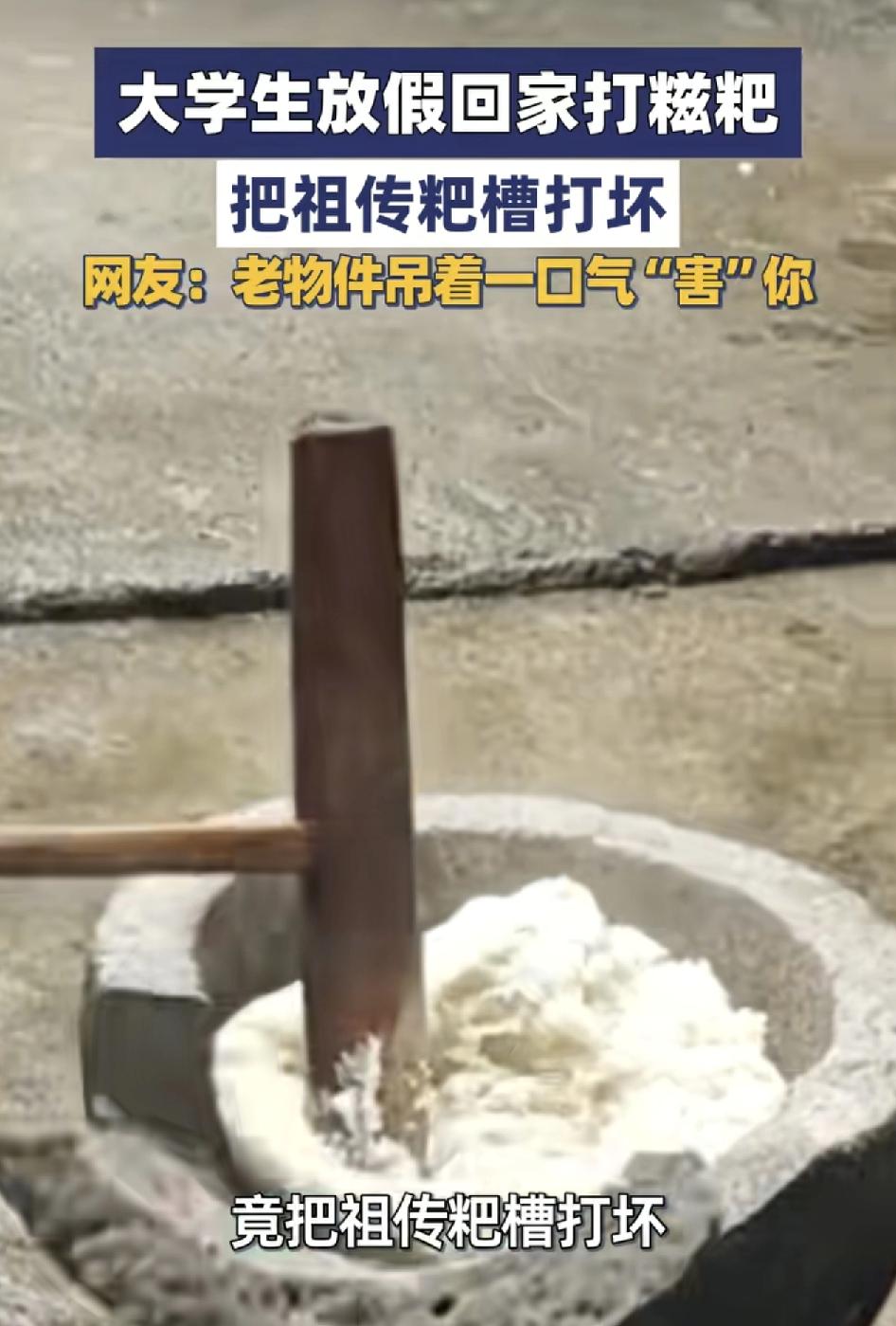 贵州一男大学生放假回家学着打糍粑,没想到一锤下去就把祖传的粑糟打坏,不过家里的长辈说,这个八槽之前就有一定的损坏,也有一定时间没有打过了,这一次一开始就被打坏,也不会责备晚辈。打糍粑也是当地传统的手艺,年轻人能积极的参与这些活动,是对传统文化的很好传承。