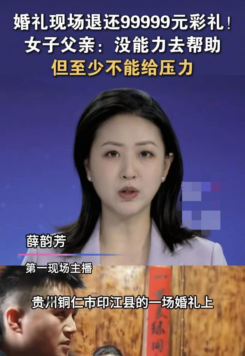 贵州铜仁一场婚礼现场。今年的父亲退还了99,999的彩礼,引发了关注。作为岳父表示没能去现场帮忙,但是至少不会给孩子压力。当地的习俗是女儿出嫁的时候,彩礼都收的比较低,不会超过6万元。据说这位父亲不仅是退还了小女儿的婚礼,在大女儿前几年出嫁时,也是没有收彩礼的。张女士收到岳父退回来的彩礼时很感动。也有网友表示,自己的女儿出嫁必须要收彩礼,毕竟养大女儿不容易。