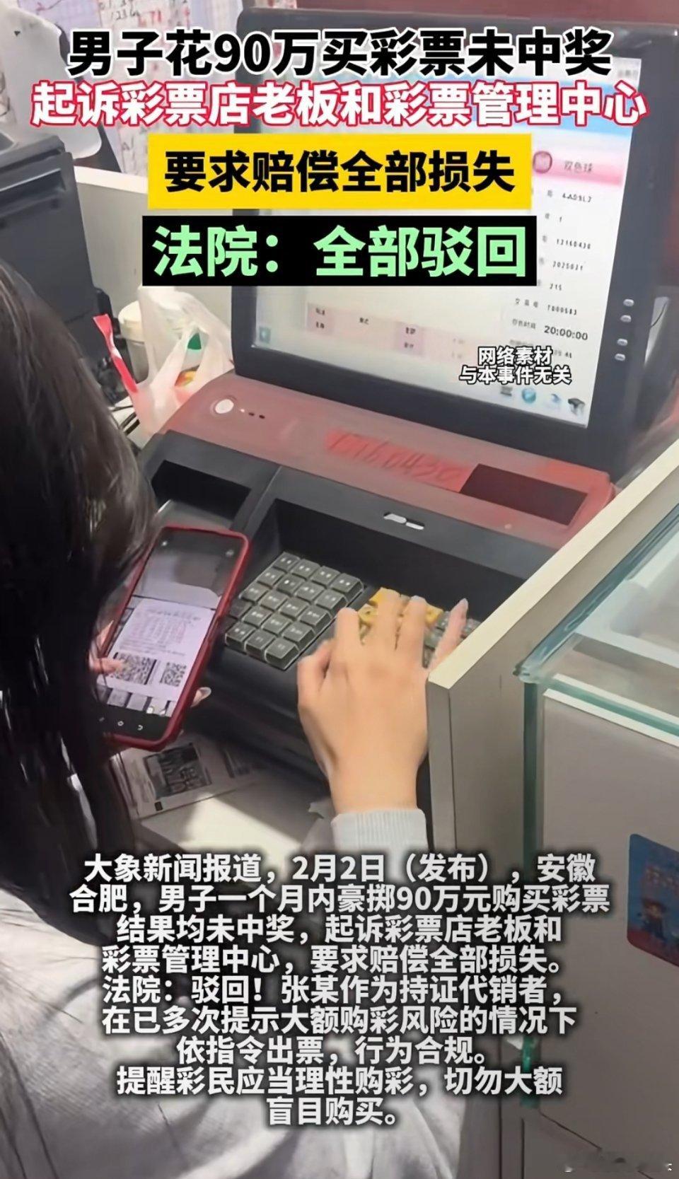 男子花90万买彩票未中奖起诉彩票店老板和彩票管理中心,要求赔偿全部损失。法院:全部驳回。