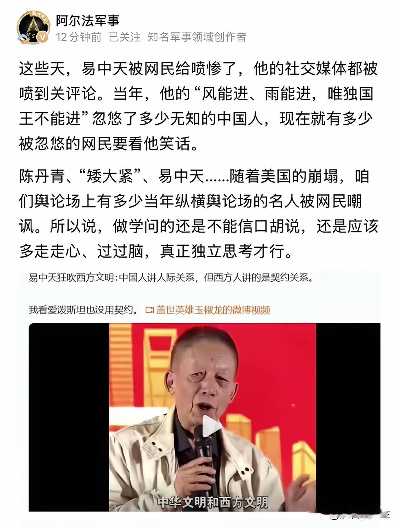 一些过去长期占据讲坛的人评论区都关了,为什么过去他们能在大众面前侃侃而谈,还能引起共鸣,而如今只落得一个关闭评论区、获得一个“滚”字的评论呢? 因为有牢A这些人把他们的滤镜打破了,他们口中吹嘘的“风能进雨能进”和驾驶证上的“捐赠”行为被无情的撕去了面具。 占据讲坛吹嘘独立思考的那个老头、还有被戏称为“矮大紧”的这些人他们的陈词滥调已经被戳破了,他们吹嘘的灯塔下面原来藏污纳垢。 就像评论区里说的:那个吹嘘独立思考的老头是不是也去逻辑岛看过大门。