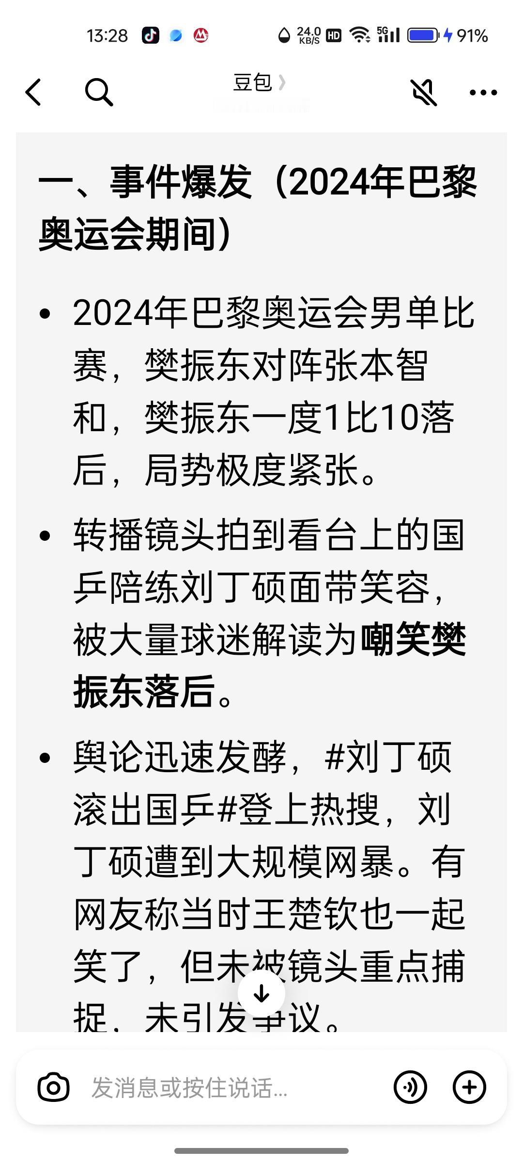 刘丁硕呀,刘丁硕!此地无银三百两,你应该是晓得的!希望你不要再翻巴黎赛场上偷笑这件事了,越翻反而越容易引发误解,在樊振东落后张本智和的时儿,你没笑樊振东,你纠究笑啥哩!不翻的话或许大家慢慢就就忘了!只要你没笑樊振东,问心无愧就行了!那个晚上樊振东的挥汗如雨地比拚,犹如在昨天,只要是纯正的中国人,都会为樊振东揪心的,为樊振东加油的!你刘丁硕也不会例外吧!