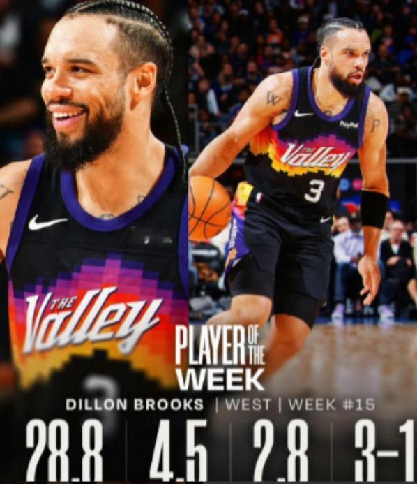 狄龙本赛季算彻底熬出头了! 2026年2月3日,NBA官方正式公布了第15周东西部周最佳球员,太阳队的狄龙-布鲁克斯成功当选西部周最佳,这也是他职业生涯首次获得这一荣誉,算是彻底熬出了头。 和他一同当选的,是东部黄蜂队的布兰登-米勒,而西部还有东契奇、杜兰特等多位球星获得提名,狄龙能从中脱颖而出,足以证明他上周表现的含金量。 狄龙能拿到这份荣誉,最关键的是在球队困境中扛起了进攻大旗。 上周太阳队遭遇了严重的后场伤病危机,核心后卫布克因为脚踝受伤缺阵,另一位球员格林也受腿筋伤势影响无法登场,球队的得分和轮换都面临巨大压力。 就在这样的情况下,狄龙站了出来,成为球队最靠谱的得分点。 整个上周的四场比赛里,狄龙始终保持着稳定且高效的发挥,带领太阳队拿到了三场胜利,只输了一场,成功稳住了球队西部第七的排名。 其中对阵东部第一的活塞队时,他打出了职业生涯最佳表现,不仅得分创下个人新高,还兼顾了篮板和助攻,帮助球队大胜对手。 另外几场比赛,他也都保持着稳定输出,没有出现状态起伏的情况,即便对阵篮网时卷入混战吃到恶意犯规,也没影响他的赛场发挥,依旧帮球队锁定胜局。 这份爆发并非偶然,而是狄龙休赛期苦练的结果,上赛季效力火箭时,球队在季后赛落败后,他就下定决心提升自己的得分能力,整个夏天都泡在训练馆里,打磨投篮和突破技巧。 加盟太阳后,球队给了他更多战术信任,主教练还专门为他设计单打战术,让他彻底释放了进攻天赋,摆脱了过去只靠防守立足的标签。 此前狄龙在联盟中争议不小,因为强硬的防守风格常被贴上“恶汉”标签,进攻端也一直没能得到太多认可。 但本赛季他彻底完成蜕变,不仅进攻效率大幅提升,还能在关键时刻为球队挺身而出。 这次当选周最佳,是对他努力的最好肯定,也标志着他从边缘角色球员,正式成长为太阳队的核心战力,算是真正熬出了头。 以上都是个人观点,对此您有什么不同的看法,可以在评论区留言讨论!!!