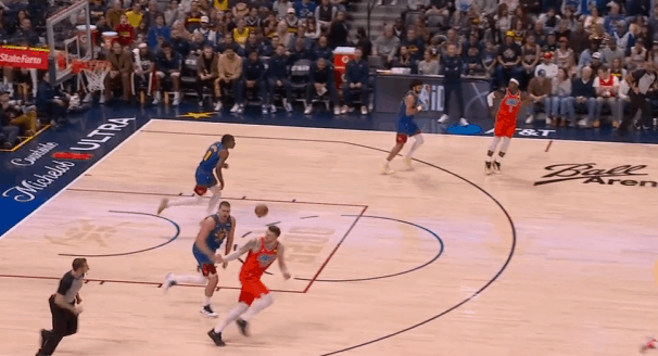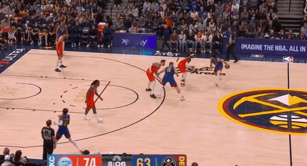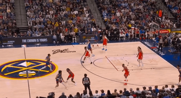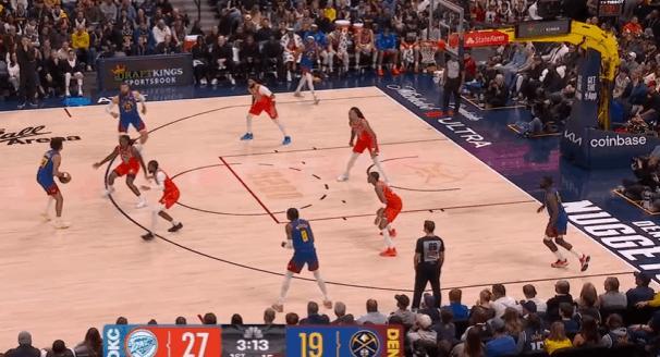 P1约基奇、穆雷、沃特森三人上线发动“Flare Slip”,穆雷交球给高位发牌约基奇后沃特森立即为其设置“Flare Screen”,随后快速拆开切入篮下。卡森执行换防,多特没意识到沃特森突如其来的掩护,被打了措手不及,因此沃特森完全摆脱防守中路长驱直入。接球后迎着底线回收两人强硬单臂隔扣回收补防的切特。