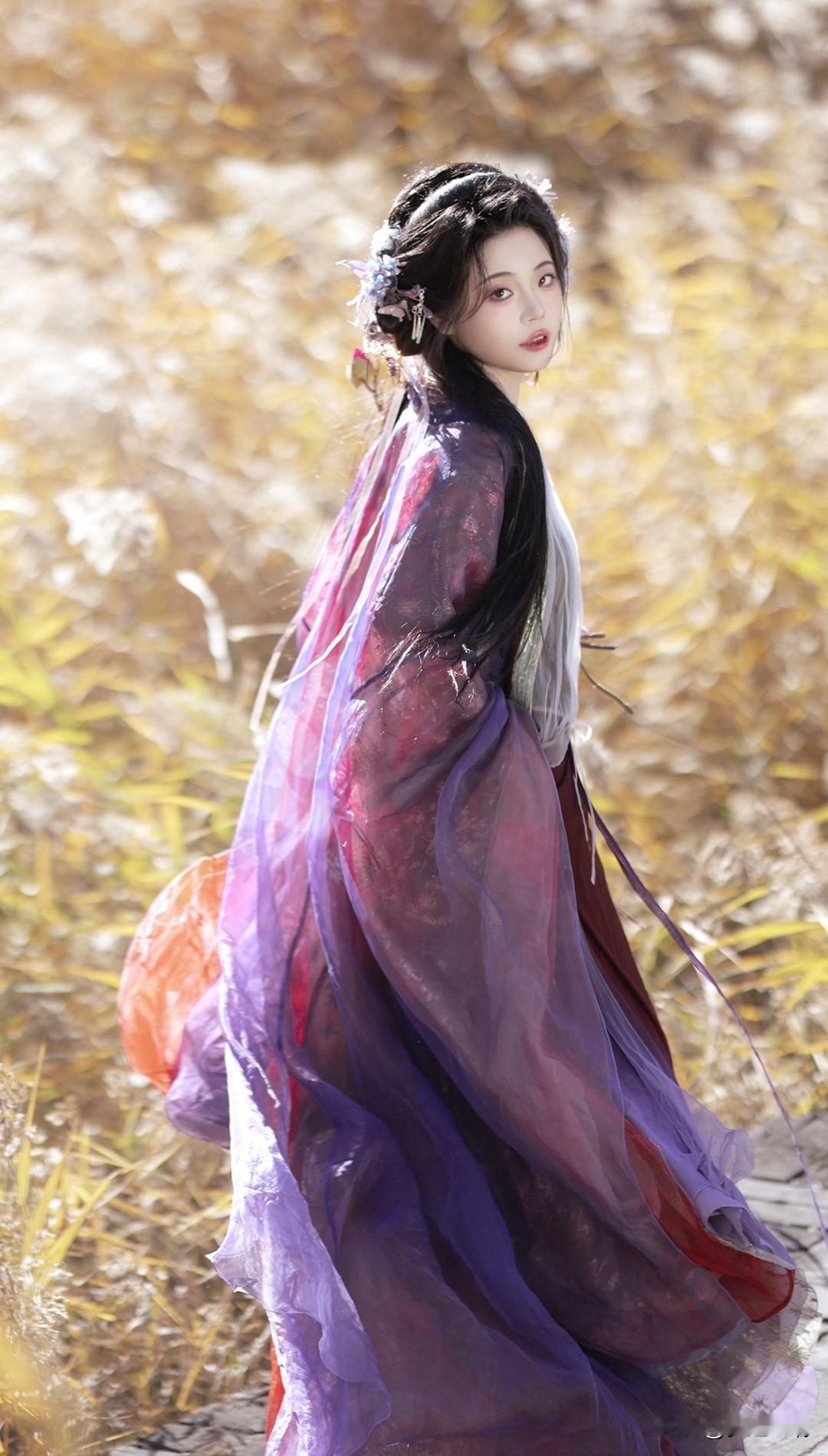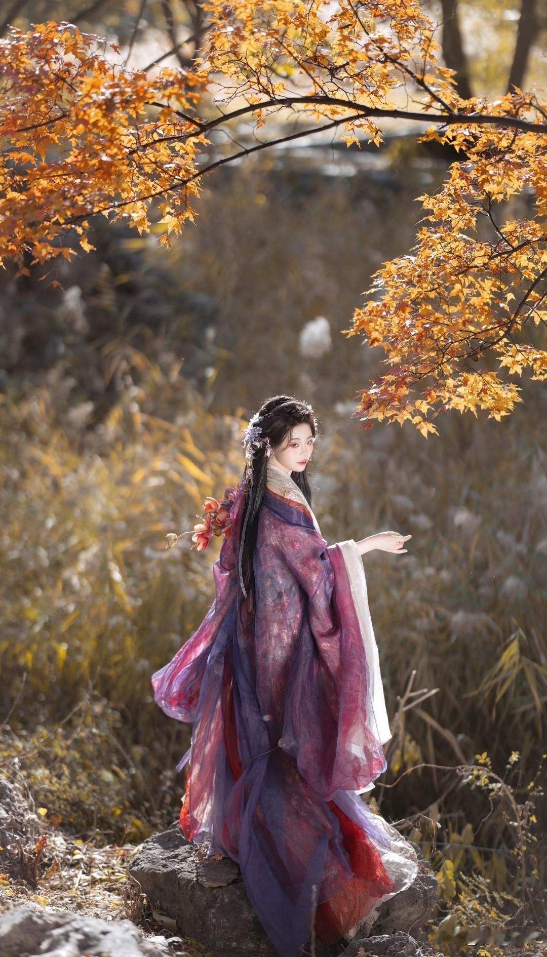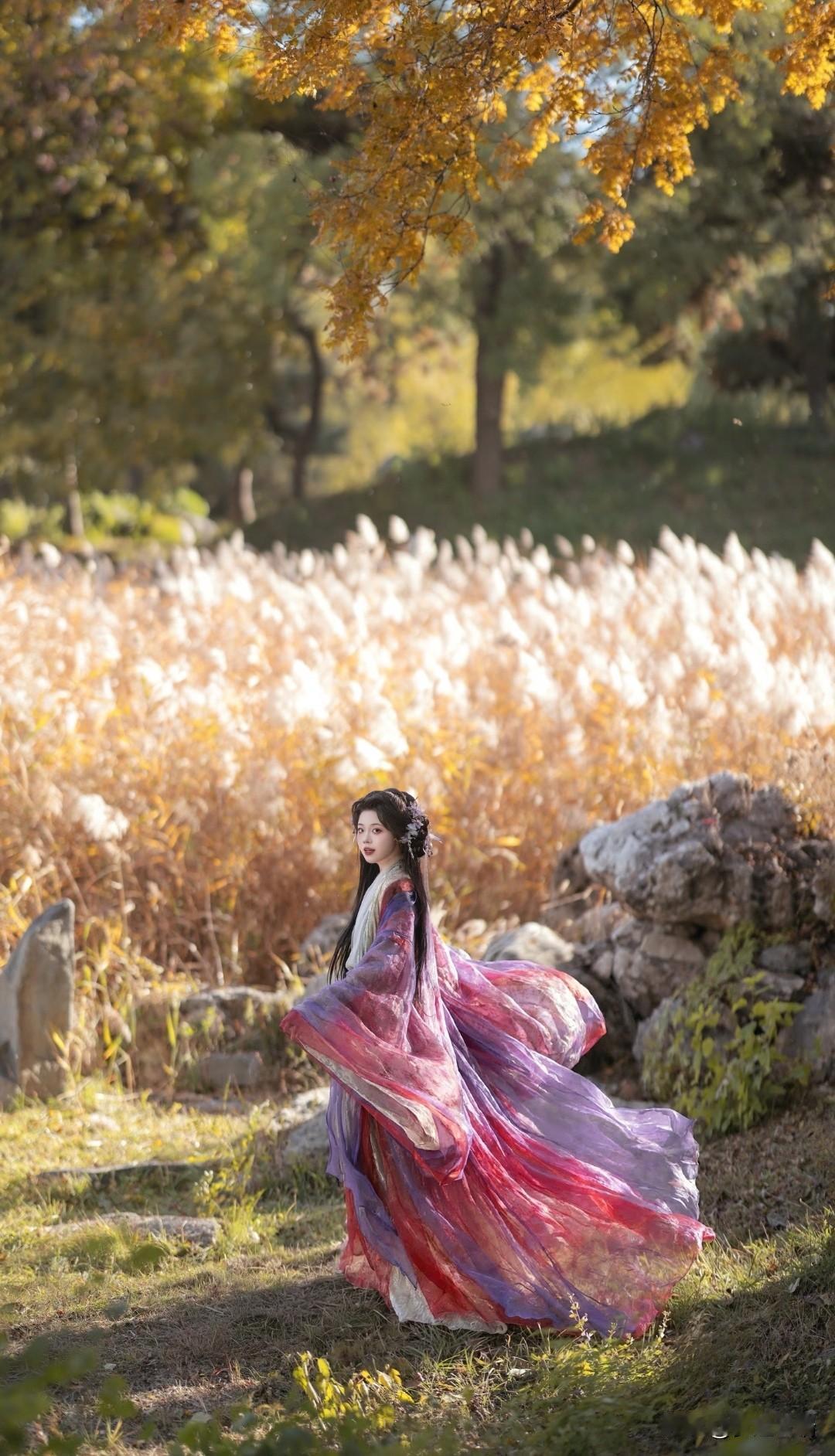 古风少女漫步在秋日田野,裙摆随风飘扬,如梦似幻。