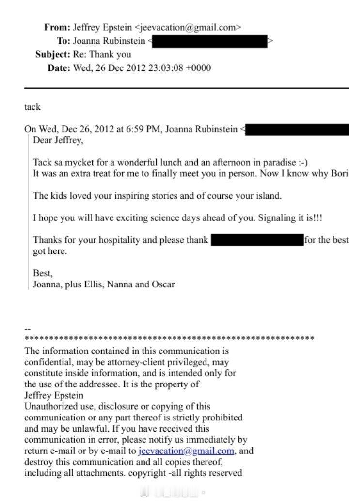 瑞典联合国难民署筹款基金会主席约翰娜·鲁宾斯坦(Joanna Rubinstein)被 爱泼斯坦档案 揭露,她曾给爱泼斯坦去信,称“孩子们都喜欢你的故事,还有你的小岛。” 鲁宾斯坦随后辞职。另,她是犹太人。联合国的难民机构,实际上主要就干两件事情:一是贩卖人口(主要是妇女儿童),二是通过救灾贪污。当年大嘴女星,就是上了他们的贼船。