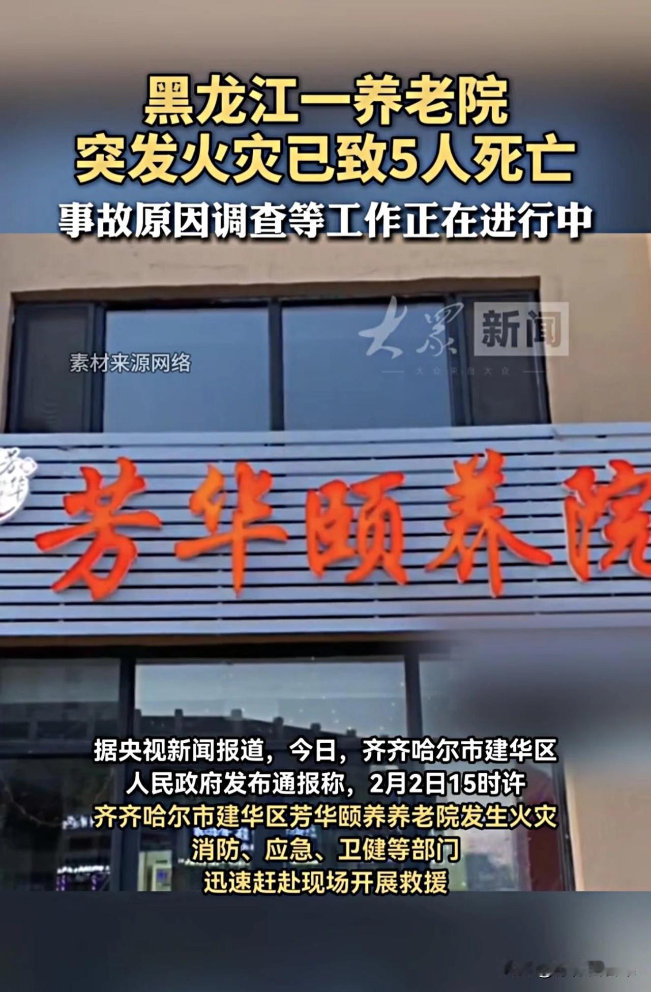 今天刷到这条新闻,心里堵得慌。 2月2日下午3点,齐齐哈尔建华区芳华颐养养老院突发大火,滚滚浓烟中,5位行动不便的老人没能逃出来,永远离开了这个世界,还有4人被烧伤送医。 更扎心的是,这家养老院早在2023年就被查出消防隐患,处罚单都开了,可问题却一直没解决。这次起火的源头,只是一个私自组装的不合格移动插排!短路的瞬间,点燃了易燃的气垫床垫,再加上建筑里违规使用的聚苯乙烯夹芯彩钢板,火势像脱缰的野马,短短9分钟就酿成惨剧。 老人们腿脚不便,视力模糊,他们连反应的时间都没有,就被浓烟和烈火包围。 处罚不是走过场,整改更不能喊口号。 如果3年前的隐患能彻底消除,如果不合格的插排能被及时丢弃,如果违规的建材能被坚决更换,这5条鲜活的生命,是不是就不会消失?我们把他们送到养老院,是为了让他们安享晚年,图的是一份安心,可换来的却是这样的噩耗? 马上过年了,恳请所有养老机构和监管部门都醒醒:别等悲剧发生才追悔莫及,让老人能安心过年!