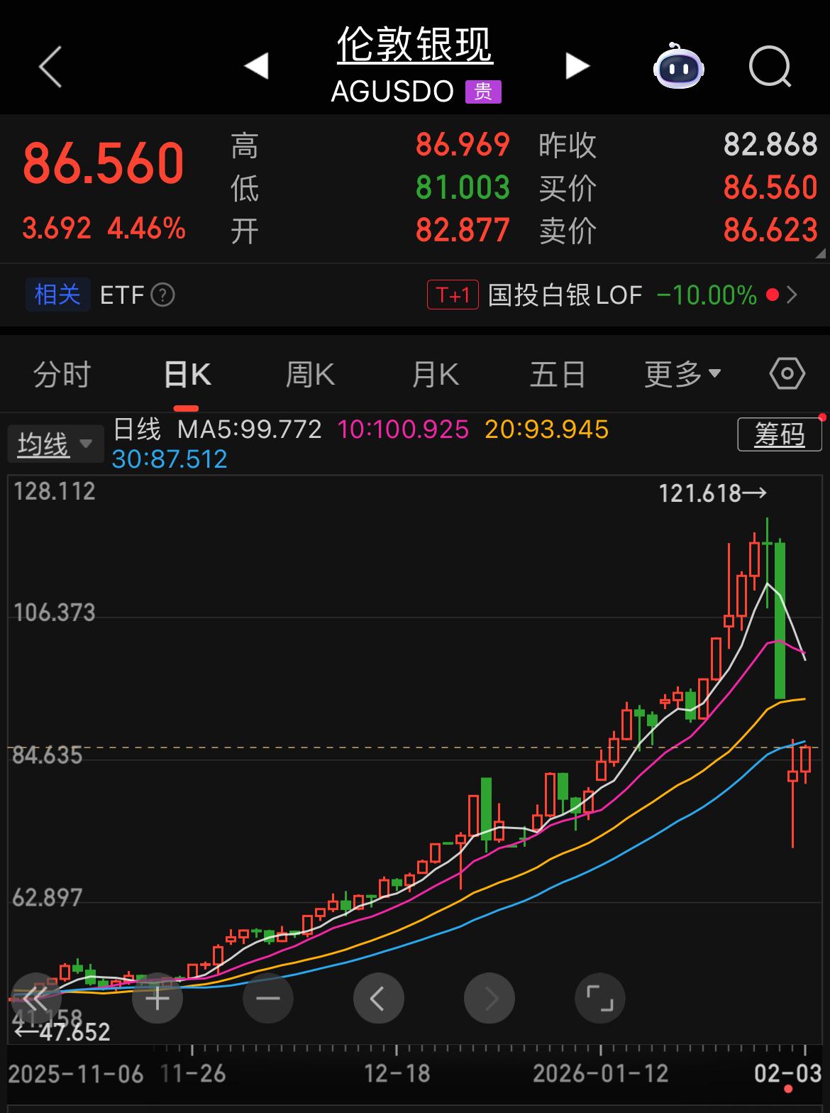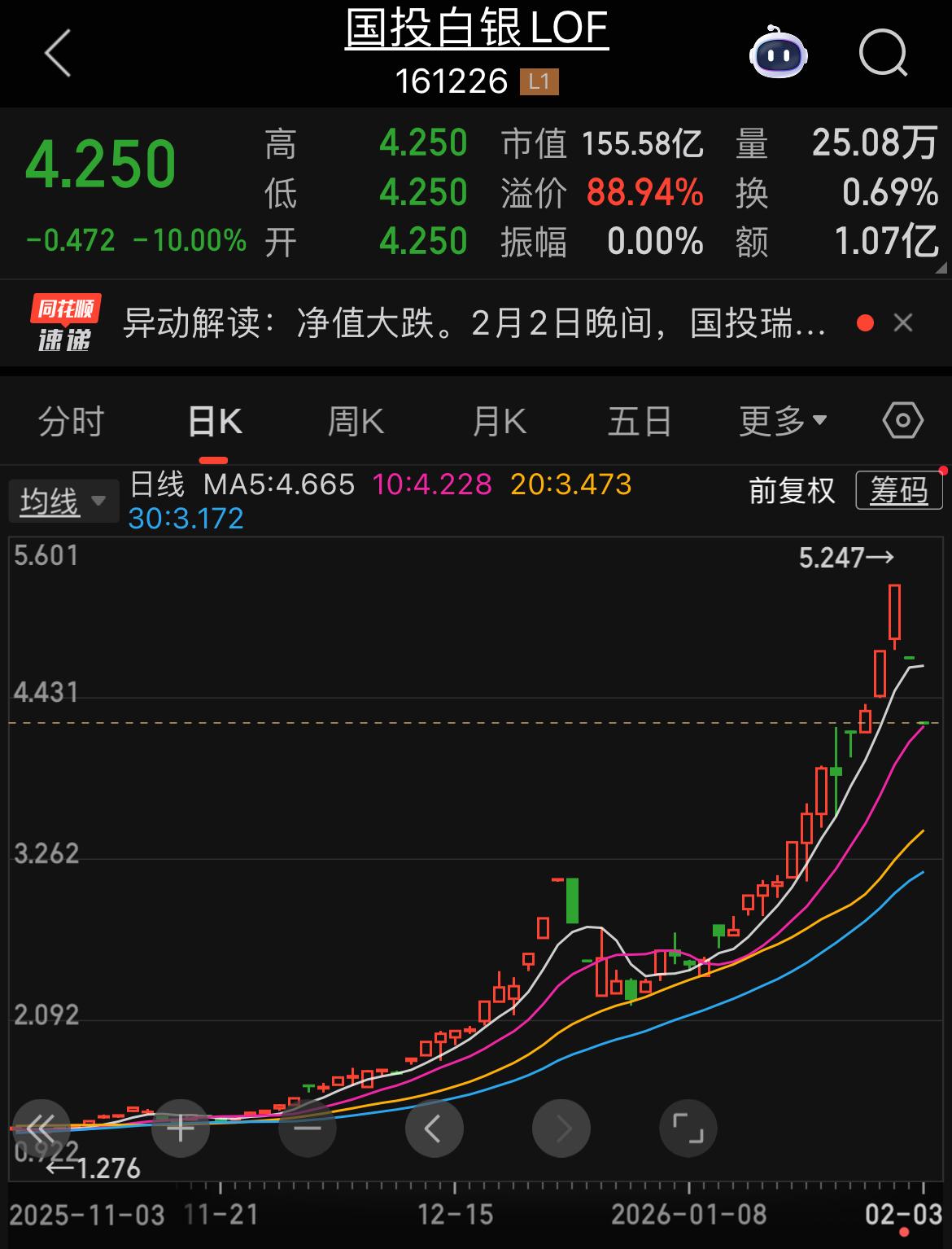 2月3日,国投白银LOF连续第二日跌停,场内交易价格报4.25元/份,而其最新公布的基金份额净值仅为2.2494元,溢价率高达88.94%。 主要原因是上周五国际现货白银跌的坑太大了(基金单日净值暴跌31.5%),而基金由于涨跌幅限制,远未跟上净值跌幅。 简言之:净值“一步到位”跌透,基金“慢慢补跌”,导致溢价被动飙升。