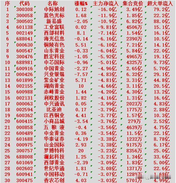 2月3日尾盘30分钟,主力资金大幅卖出的30名单! 中际旭创(代码:300308):净流出 16.0亿元,超大单流入 79.2亿元。 蓝色光标(代码:300058):净流出 11.9亿元,超大单流入 22.2亿元。 新易盛(代码:300502):净流出 10.9亿元,超大单流入 88.0亿元。 工业富联(代码:601138):净流出 9.81亿元,超大单流入 15.1亿元。 西部材料(代码:002149):净流出 7.14亿元,超大单流入 16.1亿元。