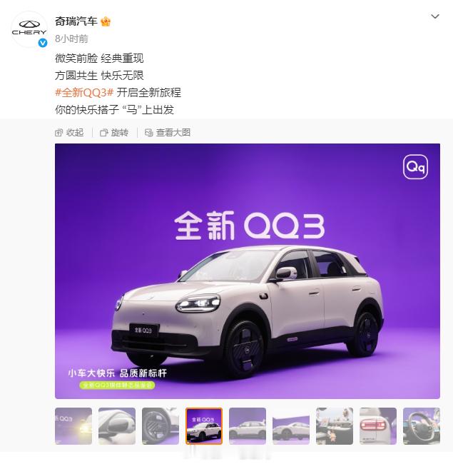 奇瑞QQ官宣回归 这个车应该承载了一代人的记忆,重新回归的新车QQ3也升级了智能化,搭载了AI灵犀智舱,猎鹰500智驾系统,支持高速NOA、全场景泊车和城市记忆领航等功能,大家看好QQ回归吗?
