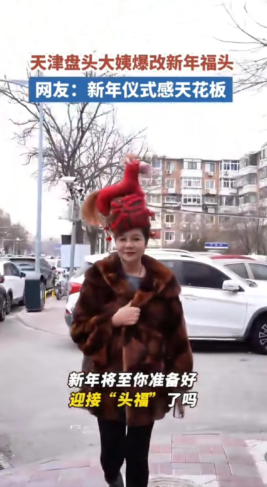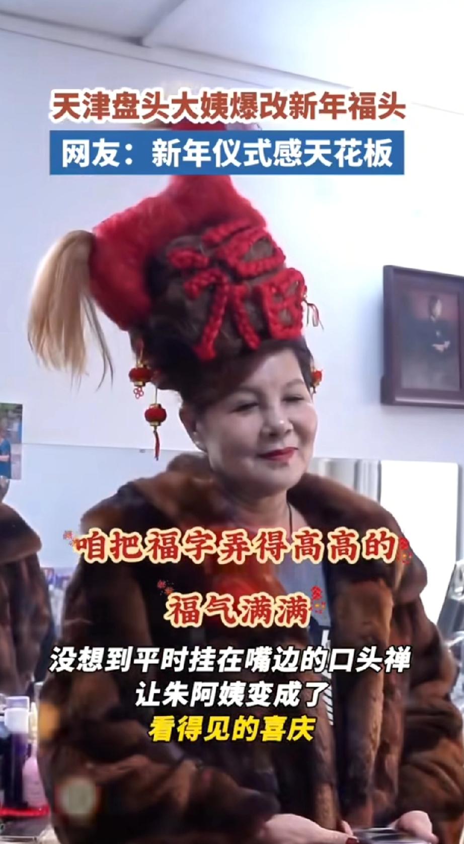 天津大姨的仪式感从来没输过, 直接把“福”字盘在了头顶, 主打一个鸿运当头。 大姨说了,福字就得弄高点! 这才是真正的“头福”, 一站那儿就是行走的新年吉祥物, 谁见了都得喊声“过年好”。 过年,洋气! 福禄好意头 天津福位
