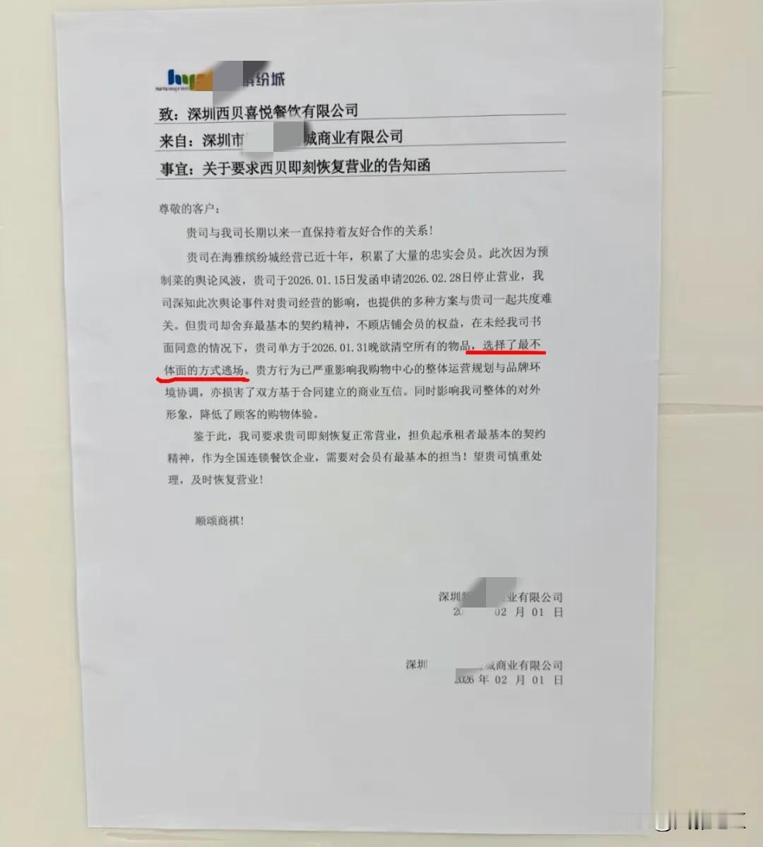 西贝被指闭店与商场“分手”不体面 没有契约精神,不顾顾客权益,单方面提前终止合同,被要求恢复营业,承担起对会员的基本担当。 深圳某商场,经营了近12年的西贝门店闭店。 尽管提前给了会员闭店信息,也提前给商场打了招呼退场,但发函给商场的退场通知书上标的时间是2026年2月28日。 在没有得到商场协商一致的情况下,突然打算单方面于1月31日提前清场走人,让商场方措手不及。 商场方指责西贝没有契约精神,要求其承担起基本责任,履行退场通知书条约,恢复营业至2月28日。 西贝这一次闭店风波,关系到100多家门店,后续退场方面还有很多繁琐合约问题需要处理,处理方式还是要慎重,避免再次陷入新一轮风波。 (信息来源:极目新闻权威报道)