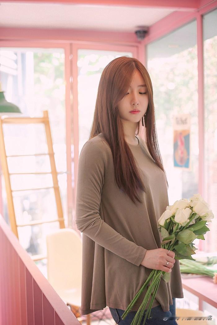 以浅卡其色内搭配深蓝紧身牛仔裤,外罩宽松粉色针织开衫,脚踩裸粉色高跟鞋,手执绿植点缀。整体配色柔和,单品兼具休闲感与女性柔美,属甜美温柔的休闲通勤风。