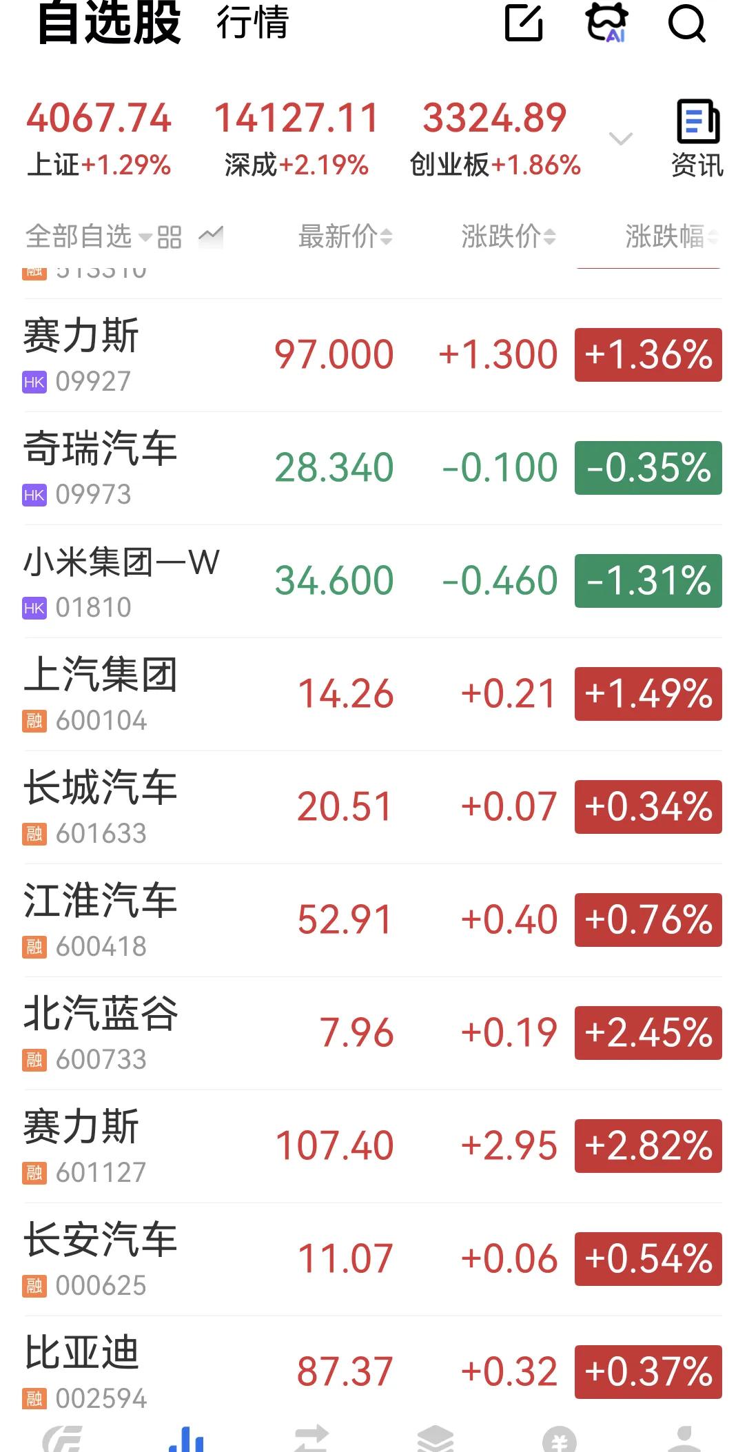 今天大部分汽车股都回涨了一些,小米汽车继续跌,赛力斯因为一月好成绩和问界M6的预热连涨了两天。 菜鸡北汽蓝谷也抖了下身体,卖的剩一点,不再卖了,看你还能滑到6块不能[苦瓜] 雷总要不你就别直播了,小米没有其他高管了吗[吐舌]