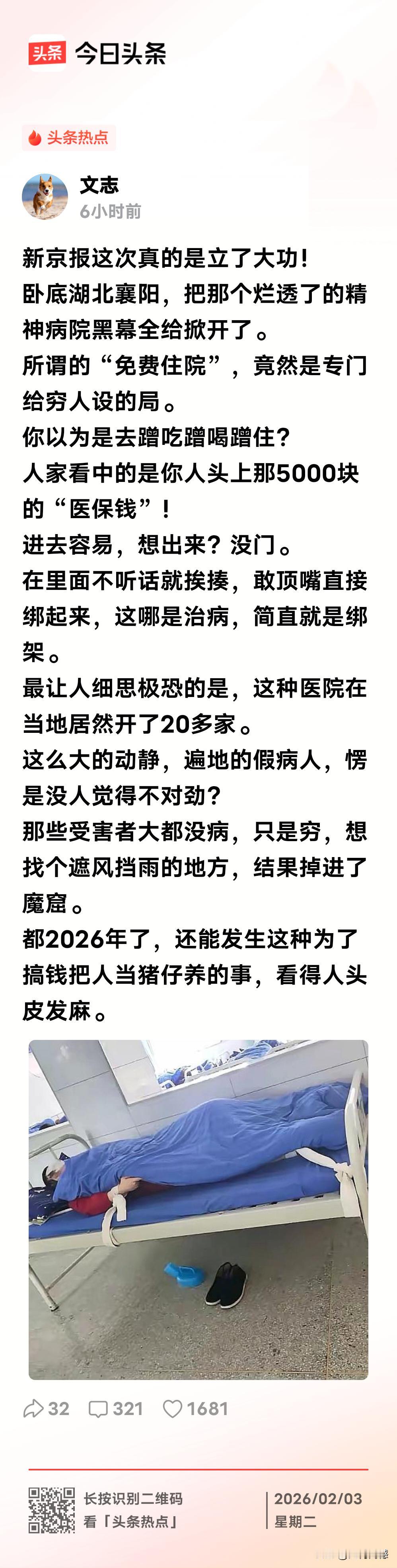 精神病院居然成了收割韭菜的一把刀,看完之后,真是佩服这些人的胆量,朗朗乾坤之下,为了点利益,竟然干出这样丧心病狂的事情,有些糊涂人为了占点白吃白喝小便宜,就被忽悠进去了,进去是进去了,想出来可就难喽,这些背后的组织者简直是无法无天,必须对这种令人发指的罪恶行为严厉惩处!