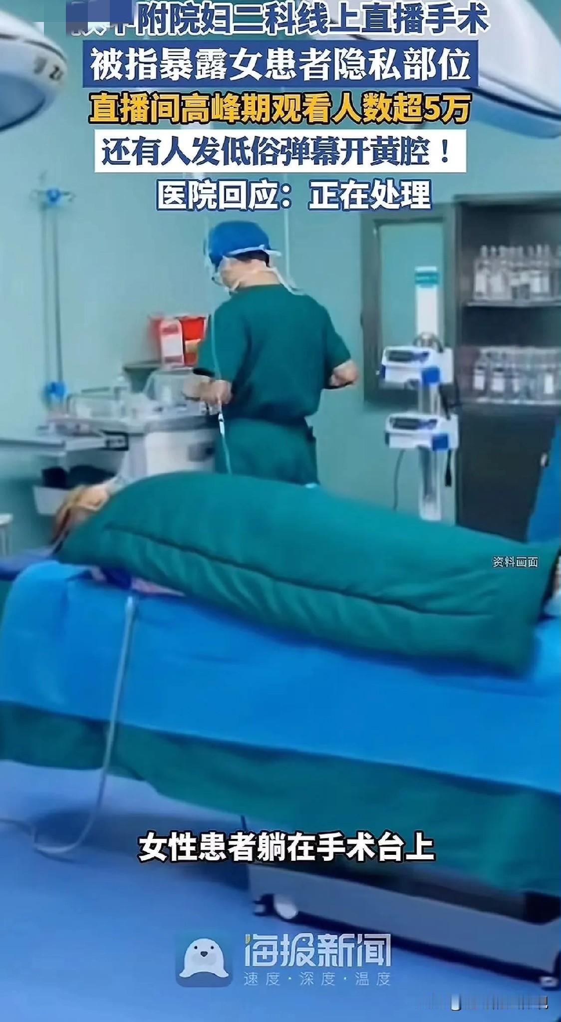 真是无法无天!陕西咸阳,某中医药大学附属医院妇二科,在网络平台直播做手术,还不遮盖女患者的隐私部位。高峰期观看人数达5万多人,有人在直播间弹幕开黄腔,被多名网友举报后,中断直播。 2月2日,不少网友跟往常一样刷社交平台,突然被一条消息差点惊掉下巴。 某中医药大学附属医院妇二科,居然在网络平台上直播做手术! 有人点进去看,手术室无任何打码处理,患者面部被覆盖,但身体关键部位完全暴露,且未见任何“已获授权”的提示。 网友们瞬间炸开了锅,纷纷在评论区表达震惊和愤怒,还有人直接进行了举报。 很快,这场荒唐的直播就被迫中断了。 这事儿一传开,立马引起了各方的广泛关注。 2月3日,涉事医院终于有了回应。 医院方表示,已经关注到这件事,目前正在处理中。 记者致电了该中医药大学附属医院医德医风监督举报专线。 工作人员核实情况后,告诉记者,他们向妇二科了解过了,说这直播其实是在平台上授课,并没有真正做手术。 当被问到后续怎么处理时,工作人员表示,如果有必要,肯定会对相关人员进行处理。 可网友们不会轻易就被糊弄过去。 从大家发布的直播截图里能清楚地看到,一位女性患者躺在手术台上,下身隐私部位完全暴露在外。 有网友说,自己原本以为就是个普通手术直播,想着能学点知识,结果看到这一幕,整个人都惊呆了。 更让人气愤的是,直播间里人数最多的时候竟然有5万人围观。 弹幕里乱成一团,甚至还有人开起了黄腔,言语低俗不堪。 这哪里是什么公开手术,或者在线授课啊,分明就是一场低俗荒诞的收割流量,是对患者隐私和尊严的粗暴践踏。 医院这么做,实在是太荒谬了。 医学伦理讲究的是尊重患者、保护患者权益。 可这家医院的行为,完全违背了这些基本原则,直接击穿了道德和法律的底线。 要知道,在正常情况下,除非是特殊情况,并且获得了患者明确同意。 否则无论是手术还是授课,都不应该在公共平台直播,而应该仅限于远程教学、科研、会诊等专业范围。 患者隐私权是受法律保护的,尤其是妇科手术涉及的隐私,更是关乎女性重要的人身权益。 这家医院到底是怎么想的,居然在公开平台上让患者当手术展示品? 这里面有太多疑问需要解答。 这场严重侵害患者权益的直播,患者本人到底知不知道情况,有没有明确同意? 就算患者同意了,在医患关系明显不对等的情况下,她真的是自愿的吗? 就算她是自愿参与直播,又有没有预料到自己的隐私会被侵害到这种程度? 再退一步讲,暴露女性隐私部位的画面,怎么能就这么在公共直播平台大肆传播呢? 从策划开播、审核批准,到过程管控,这家医院的医疗规范简直形同虚设。 连最基本的隐私遮挡都做不到,完全罔顾患者权益。 这肯定不是个别医生的私自行为,而是医院管理混乱、监督缺失,或是为了迎合流量而做出的恶果。 这种“草台班子”式的手术直播,造成的危害简直不敢想象。 对患者来说,自己的隐私画面被数万网友围观、截屏传播。 甚至还被“开黄腔”,这精神上的伤害得有多大啊,说不定一辈子都走不出这个阴影。 而涉事医院的行为,更是严重透支了公众对医疗的信任。 以后患者去医院做手术,心里都得犯嘀咕,担心自己会不会在无知无觉的情况下被围观。 这对正常的医疗秩序无疑是一种严重的滋扰。 事件曝光后,医院的态度更是让人失望透顶。 就简单回应一句“正在处理”,这种敷衍了事的说法怎么能平息公众的疑虑呢? 仅靠医院自己查,肯定无法服众,大家都会怀疑是不是在走过场、包庇相关人员。 手术台是救死扶伤的神圣地方,绝不是直播秀场,医疗伦理更不容流量绑架。 任何健康科普,都不能以牺牲人的尊严和权益为代价,这是最基本的底线。 好在当地卫健部门已经介入调查了,大家都期待着一个严肃的处理结果。 得查清楚这场直播到底有没有经过患者书面同意,有没有经过严格审批。 有没有涉及商业利益,医院管理方面是否存在失职。 对涉事人员必须依法依规追责,对违规行为严肃处罚。 《民法典》第1226条:医疗机构及其医务人员应当对患者的隐私和个人信息保密。 泄露患者的隐私和个人信息,或者未经患者同意公开其病历资料的,应当承担侵权责任。 患者到医院就诊,会向医院透露大量个人信息,包括身体状况、疾病情况等,这些都属于隐私范畴。 医院作为专业机构,有义务为患者保守这些秘密。 某中医药大学附属医院妇二科,在网络平台直播手术,暴露女患者隐私部位,明显违反了该条款。 医院没有对患者隐私进行保密,将涉及患者隐私的手术画面公开,这种行为侵犯了患者的隐私权。 应当承担侵权责任,比如向患者赔礼道歉、赔偿患者遭受的精神损失等。 这也提醒普通人,在就医过程中,自己的隐私是受法律保护的。 目前,医院回应,正在处理中。 对此你怎么看?