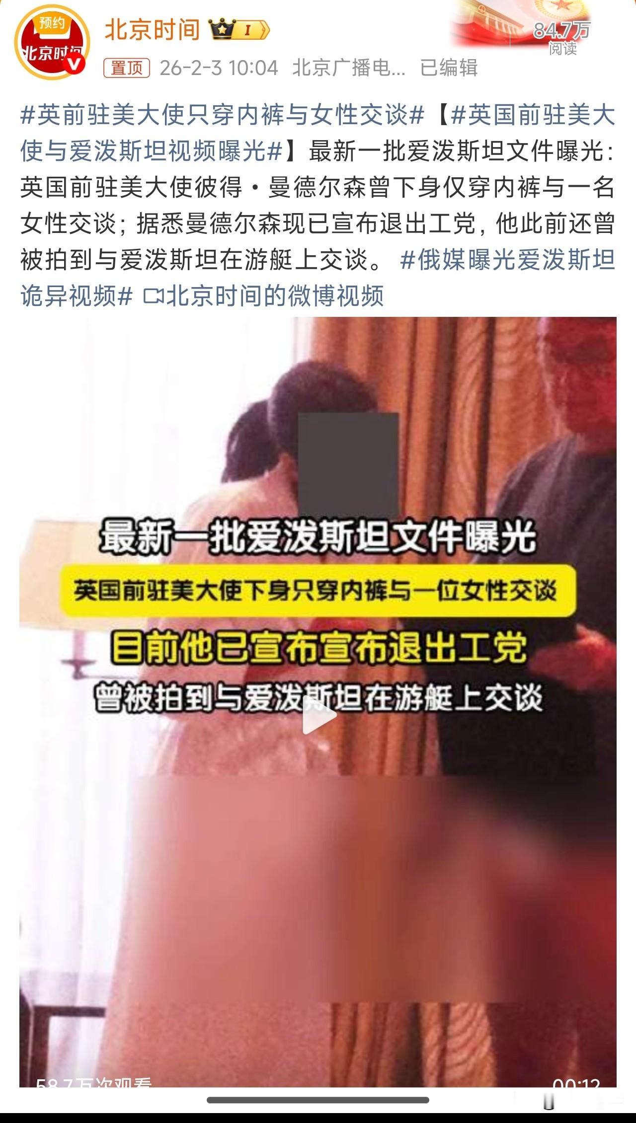 英国前驻美大使与爱泼斯坦视频曝光,这个女人,是英国前驻美大使的老婆吗?如果不是,这是干啥呢?这就是英国绅士风度?或者说英国的贵族气质?和陌生女人穿内裤相见? 我记得我们国内有一个田女士就特别推崇英国的贵族气质,以及英国绅士风度,这就是英国上层人物私下的品行? 前有英国安德鲁王子,后有英国前驻美大使,还有一个著名科学家霍金,英国人是怎么了?就算全身瘫痪了,还要上岛放纵自己?管不住下半身?