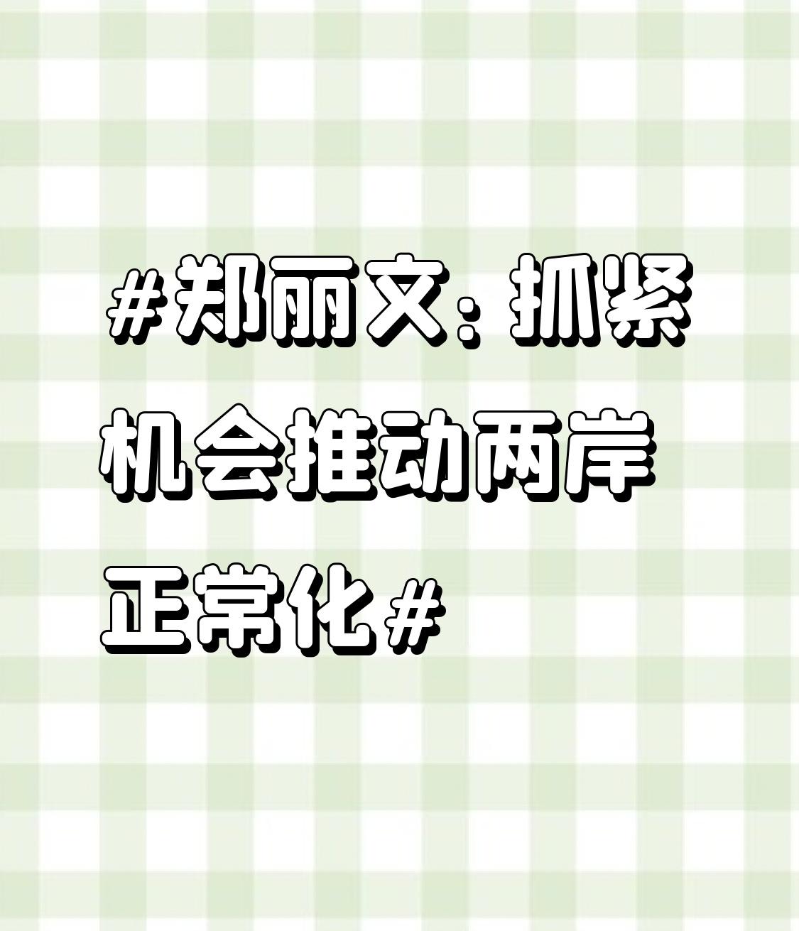 郑丽文:抓紧机会推动两岸正常化 郑丽文提出要抓紧机会推动两岸正常化,这想法太赞了!当下两岸关系受多种因素干扰,民间交流、经济合作等都受到影响。像之前两岸贸易频繁,很多台湾水果能直供大陆,大陆游客也常去台湾游玩,带动了当地经济。可后来一些杂音破坏了这种和谐。推动两岸正常化,能让台湾同胞更了解大陆,促进文化交融,也能让台湾经济搭乘大陆发展快车。如今是该排除干扰,抓住机会,让两岸关系回到正轨,实现共同发展,这才是两岸人民的共同心愿。