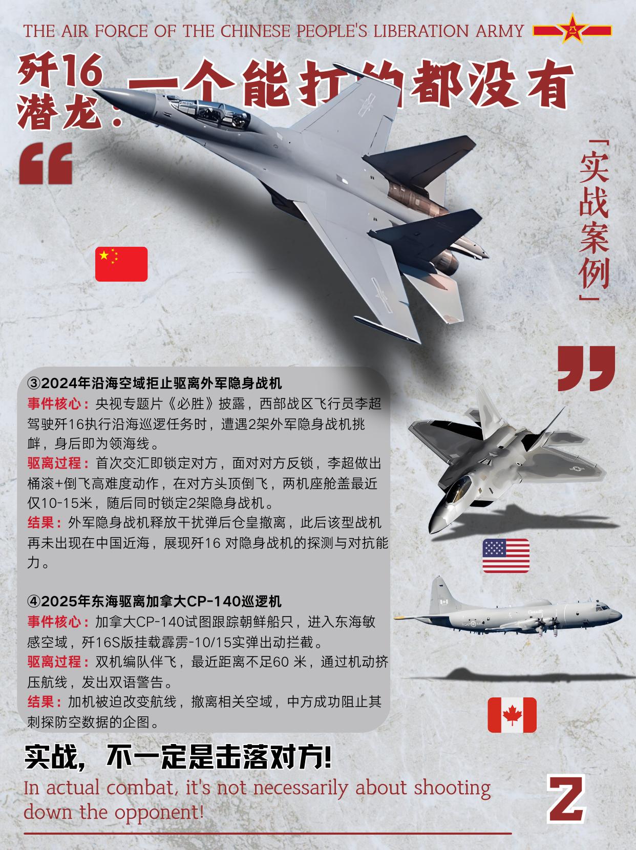 歼-16连驱隐身机与加机,实战硬底气拉满! 歼-16这实打实的锁定驱离隐形外机行动,细节里全是硬底气。 ①2024年那次挺猛的,西部战区飞行员李超驾驶歼-16 巡逻,遇上两架外军隐身战机挑衅,身后就是领海线。他首次交锋就锁定对方,还做了桶滚加倒飞的高难度动作,在对方头顶倒飞时,座舱盖最近才10-15米,最后外军战机放干扰弹仓皇撤离,之后再也没敢来近海晃悠。 ②2025 年东海驱加拿大CP-140也不含糊,加机想跟踪朝鲜船只闯敏感空域,歼-16S挂着霹雳-10/15实弹就上去了,双机编队伴飞,最近距离不到60 米,挤着它改变航线,直接让加机放弃了刺探防空数据的企图。 歼-16用一次次驱离证明,实战不一定要击落,守住底线就是胜利。