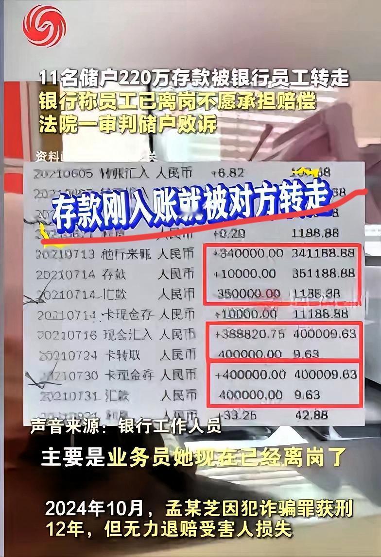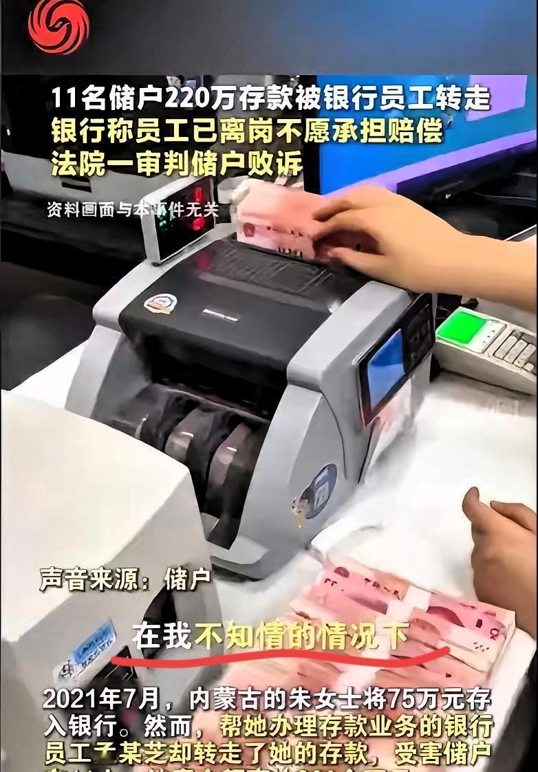 太荒唐!内蒙女子省吃俭用攒75万去金融机构存定期,柜台办业务全程核对信息,结果钱竟被工作人员悄悄转走,连同其他10位受害者,一共220多万血汗钱被挥霍一空,机构却甩锅说涉事员工已离岗,这事与他们无关,简直让人怒到发抖! 储户把钱存进机构,图的就是安心,可这家机构不仅监管形同虚设,让员工有机会钻空子私转存款,出事后还第一时间推卸责任,完全无视自己的法定责任。法律本就明确,员工履职期间的侵权行为,用人单位必须担责,一句“员工离岗”就想撇清关系,既是耍无赖,更是对储户权益的漠视。这些钱是普通人的养老钱、救命钱,机构的冷漠,寒的是所有普通人的心。 不能让储户为机构的管理漏洞买单,这是最基本的道理。你觉得这些受害者该如何维权讨回血汗钱?
