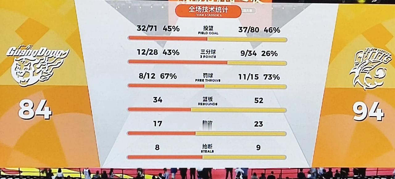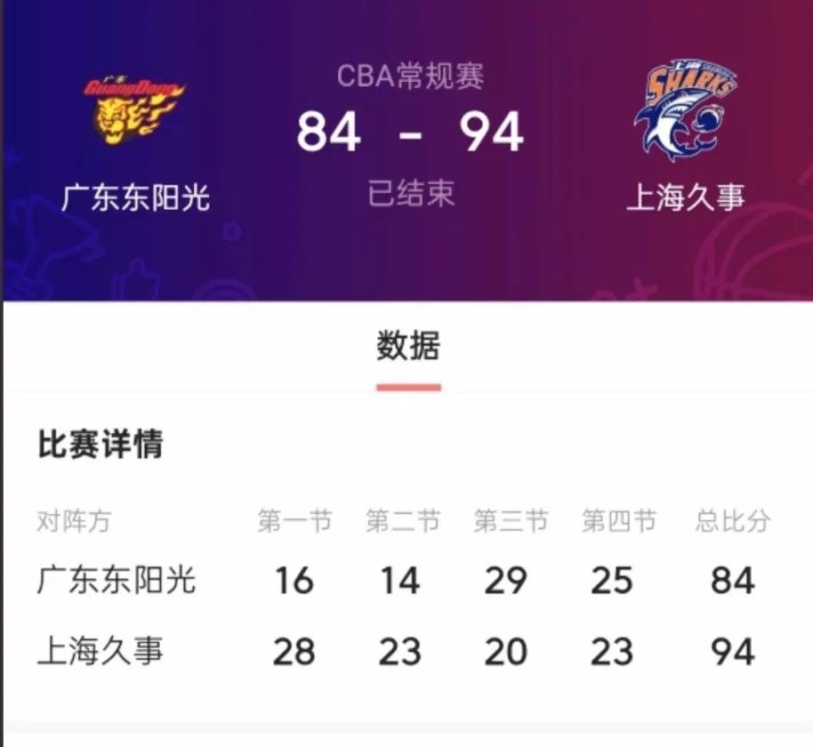 首节16-28,半场30-51,广东队上半场就输上海21分,人家得分正常,广东队才得30分,一如既往的失误连连,有点未战先怯。上半场配不上广东两字的球衣。 虽然下半场知耻而勇,一路追赶,也是实力不挤,最终84-94两输上海,不应该啊。 看了这场比赛,有点怀念易建联,假如这场比赛有阿联在,拿下上海轻松的事。 看完这场比赛,三个外援惟有萨姆纳充满斗志,有不服输精神,奎因打不了强队,萨林杰真的老了。 这个赛季广东队想夺冠的话,必须裁掉这两个,另外引入两个中锋。也不为别的,得对得起现场满座的热情球迷。 千万不要拿广东队缺兵少将来说事,事实摆在这里,不要让对手教练卢伟蔑视的眼光。 两负上海,意难平,不应该。