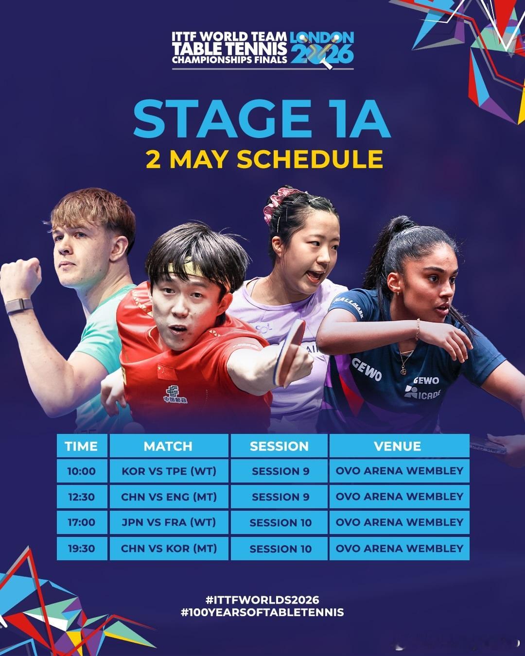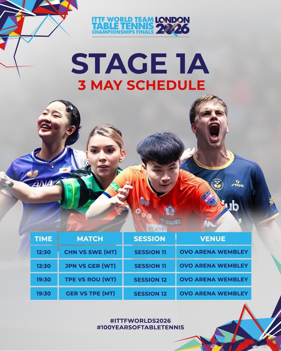 伦敦世乒赛团体赛5月2日、5月3日小组赛A阶段赛程表