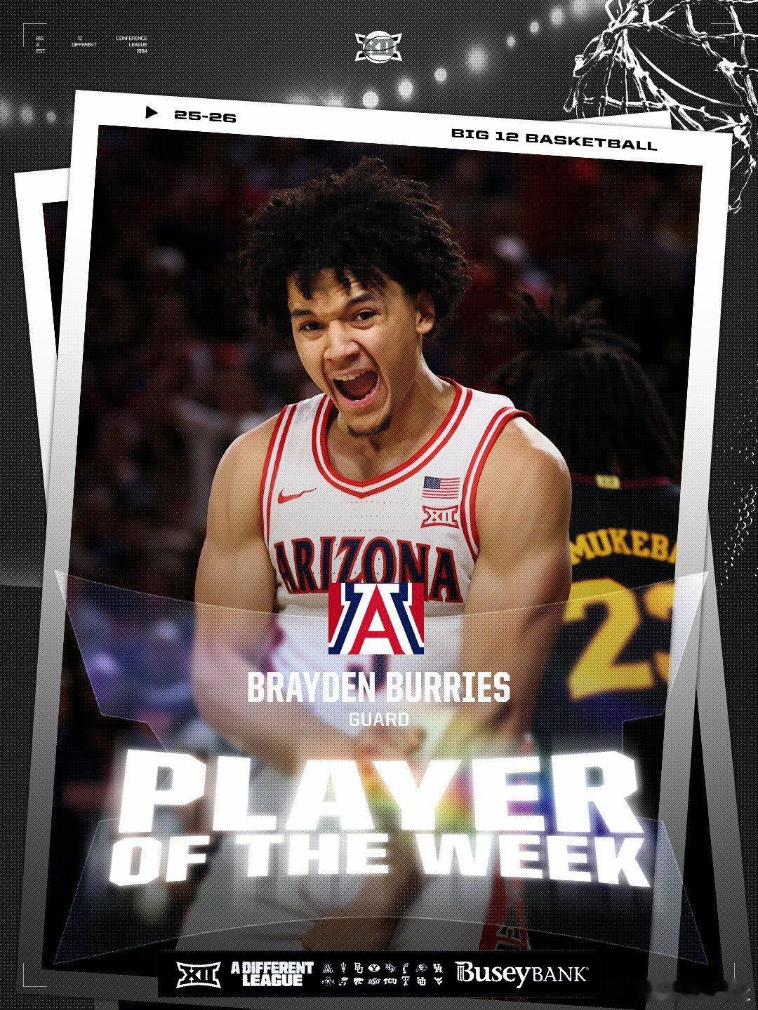 Big 12联盟第13周表现奖(2025-2026赛季)。NCAA男篮最佳球员:Brayden Burries,最佳新生:Brayden Burries。NCAA女篮最佳球员:Snudda Collins,最佳新生:Jaliya Davis。