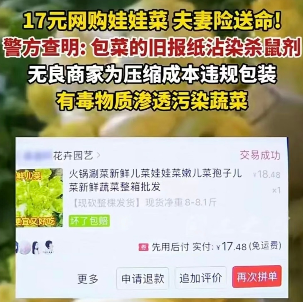商家真的好无辜啊,店都关了,生意真不好做。分析:夫妻网购娃娃菜吃中毒系合谋下毒【当地官方:“网购娃娃菜食用后中毒”系夫妻合谋、意图骗赔,均被刑拘