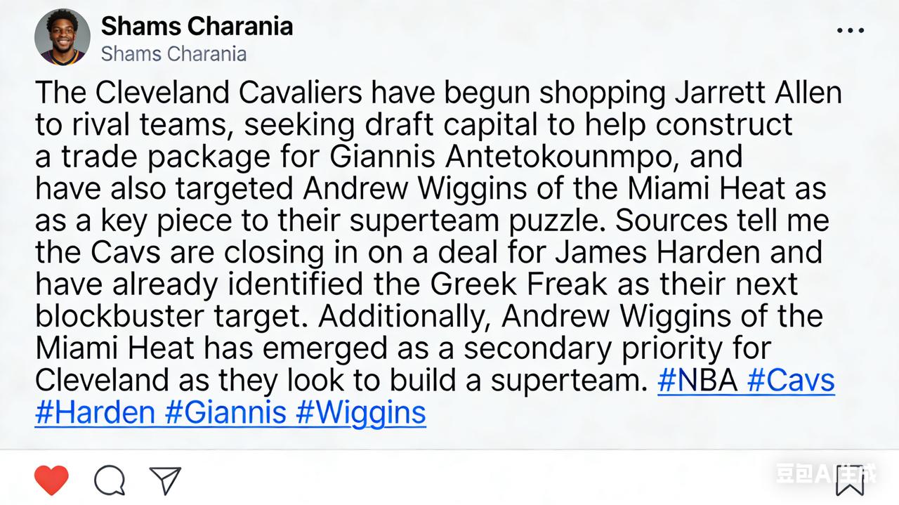 Shams:“骑士队与哈登的谈判非常顺利,骑士队向哈登承诺,他们的下个目标是字母哥或热火队的维金斯。骑士队已经将阿伦摆上货架,湖人队对阿伦非常有意。”