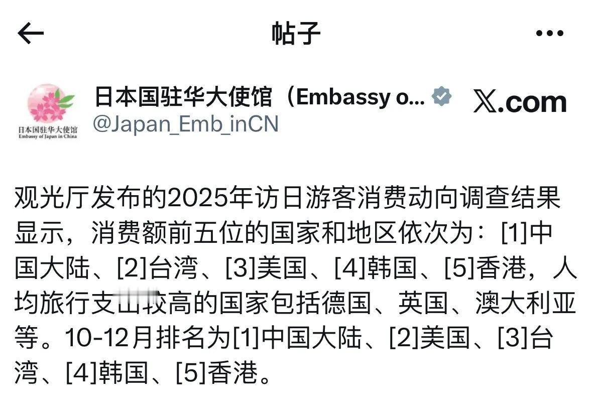2025年中国大陆游客稳居全球访日游客消费额第一,即便是高市上台后的10-12月份也是如此。 不过2026年的数据就难说了。