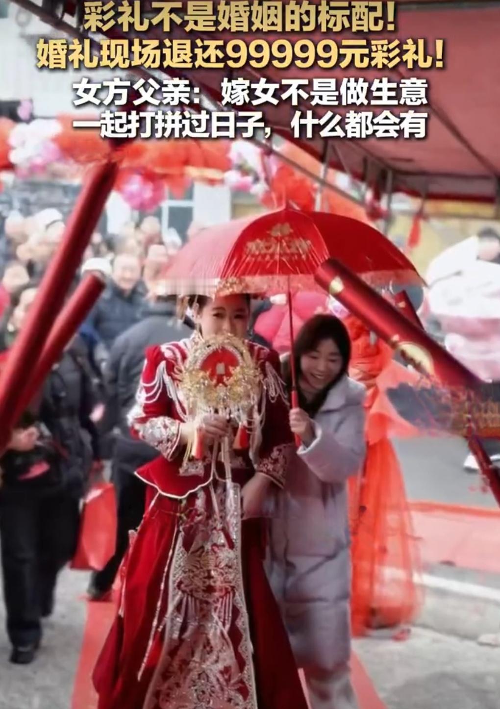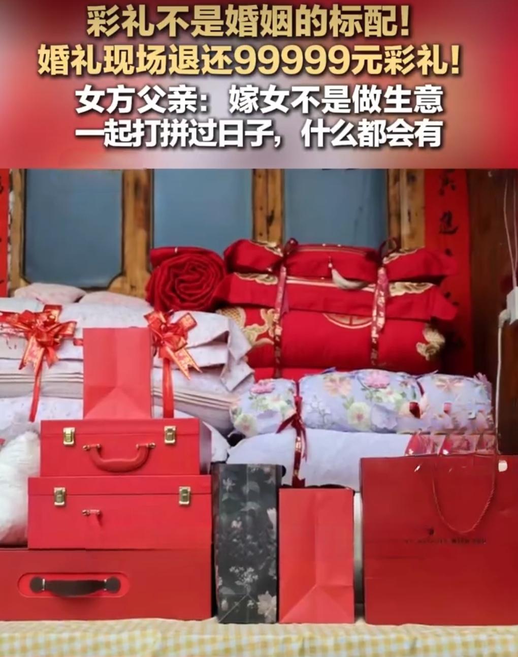 大年初三,贵州铜仁印江县的一场婚礼“火”了。不是因为场面有多豪华,而是婚礼上出现了令人动容的一幕—— 新郎按当地习俗,带着99999元的彩礼上门迎亲,寓意“长长久久”。没想到,新娘的父母当场就把这笔钱原封不动地退还给了女婿。 新娘父亲陈学钊对着全场亲友说:“我们做父母的,没有能力多帮助孩子,但至少不能给他们增加压力。” 村里干部后来证实,这已经不是陈学钊第一次这样做了。几年前大女儿出嫁,他们同样一分彩礼没要。在他们看来,女儿的幸福,比任何“礼金”都重要。 很多人说,这才是嫁女儿该有的样子。 这几年,关于“天价彩礼”的新闻时不时就上热搜,有些地方甚至把彩礼当成攀比、敛财的手段,让小两口刚结婚就背上一身债。 但陈学钊夫妇的做法,像一股清流——他们想的不是“养女儿花了多少钱,得要回来”,而是“孩子要开始新生活了,我们得推他们一把”。 这不是说彩礼传统就该全盘否定。适当的礼仪和心意,是双方家庭的尊重。但关键在“心意”二字,不在数字大小。像陈学钊这样,把彩礼当成一种形式,最终又返还给新人,既保全了礼数,又实实在在为小家庭减了负。这份通透和疼爱,比十万块钱更珍贵。 结婚不是买卖,而是两个年轻人携手新生活的开始。彩礼本该是锦上添花的祝福,而不应成为压垮新人的负担。 贵州这位父亲的举动之所以能打动这么多人,正是因为他用最朴素的行动说出了一个道理:真正的爱,是成全,而不是索取。 祝福这对新人,也为这样明事理、有温度的父母点赞!希望这样的风气,能越传越广。挣钱难还是借钱难