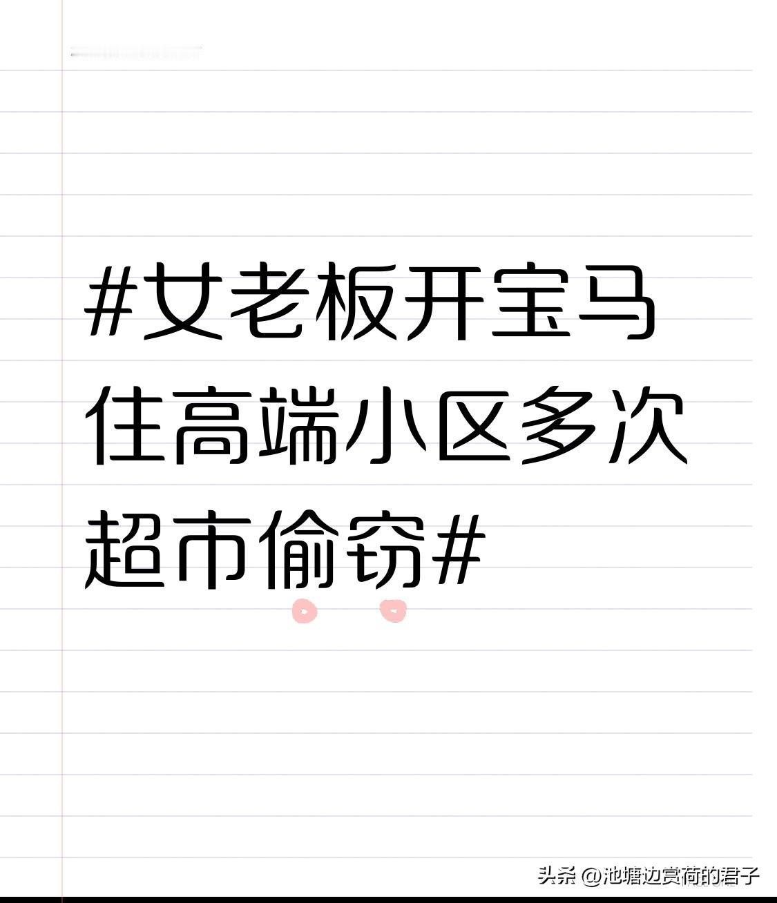 女老板开宝马住高端小区多次超市偷窃 开宝马住高端小区的女老板,竟多次在超市偷窃,这事儿太离谱了!这位李老板,经营着注册资金200万的公司,生活条件优渥。可她却在短短三个月内,多次在超市“顺手牵羊”,未付款带走进口水果、高档洗发水等商品。 超市起初以为是偶发事件,后来调取监控才发现是她多次作案。面对证据,她一开始还否认,最后才承认五次盗窃事实。 专家说这可能是“偷窃癖”,不以获利为目的。但不管怎样,这种行为都突破了道德底线。再有钱,也不能干这种事儿啊!