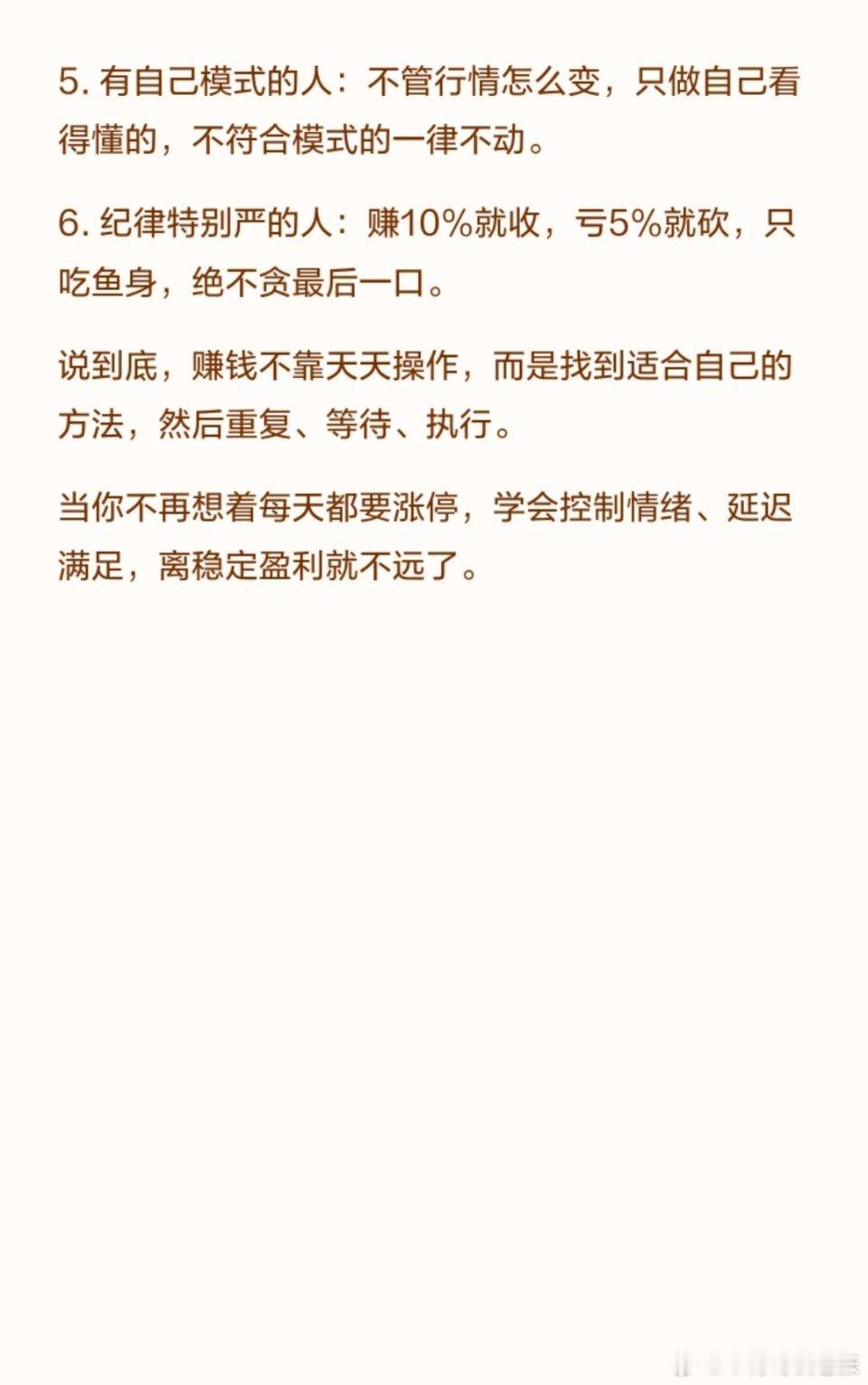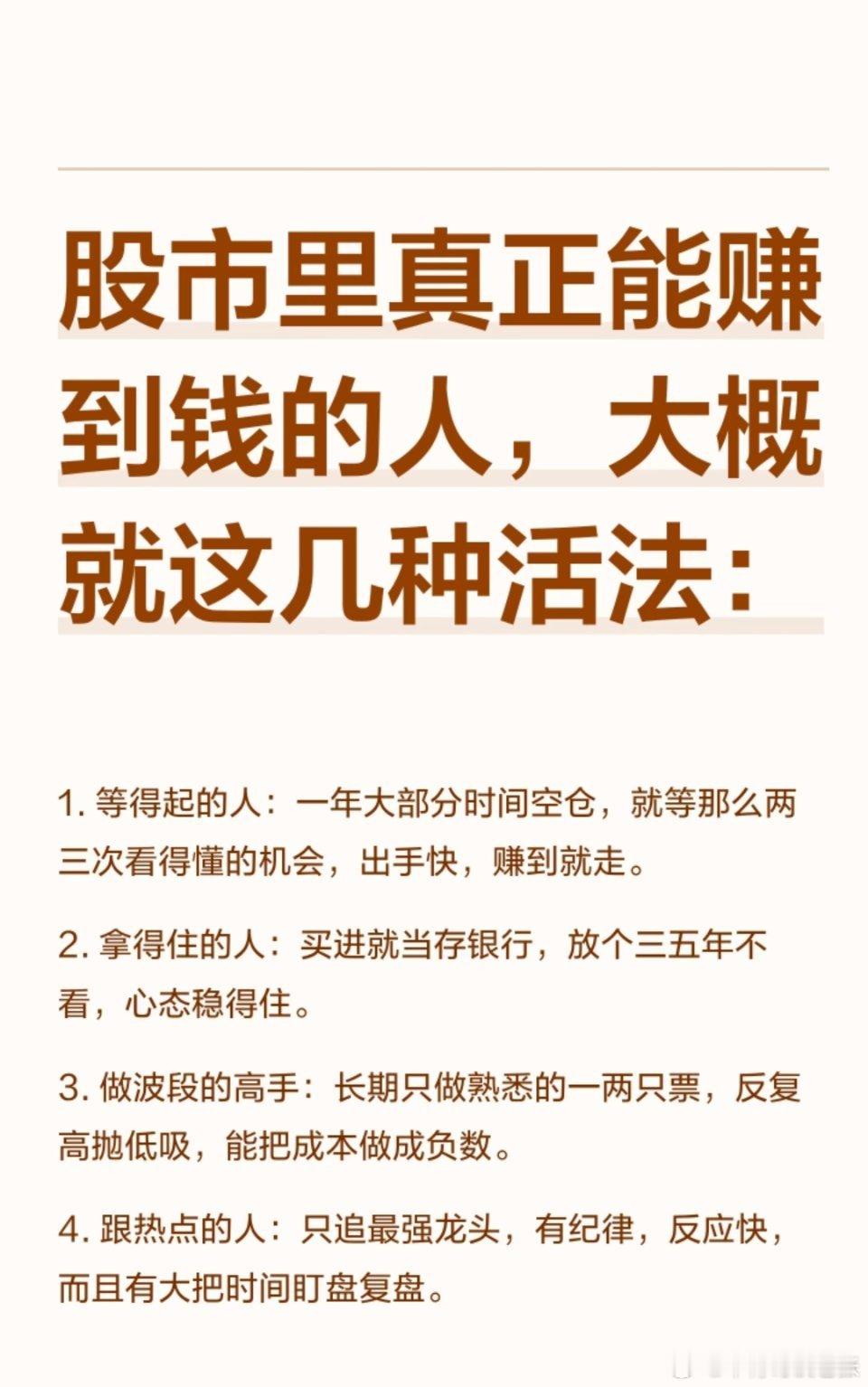 股市里真正能赚到钱的人,大概就这几种活法:赚钱靠的是找到适合自己的方法,如等待机会、长期持有、波段操作、追热点、坚持模式或严格纪律。关键在于控制情绪、延迟满足,重复、等待并执行策略,而非盲目操作。稳定盈利源于找到适合自己的方法并坚持执行。