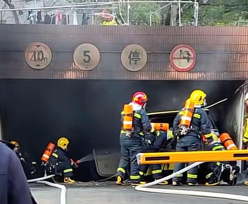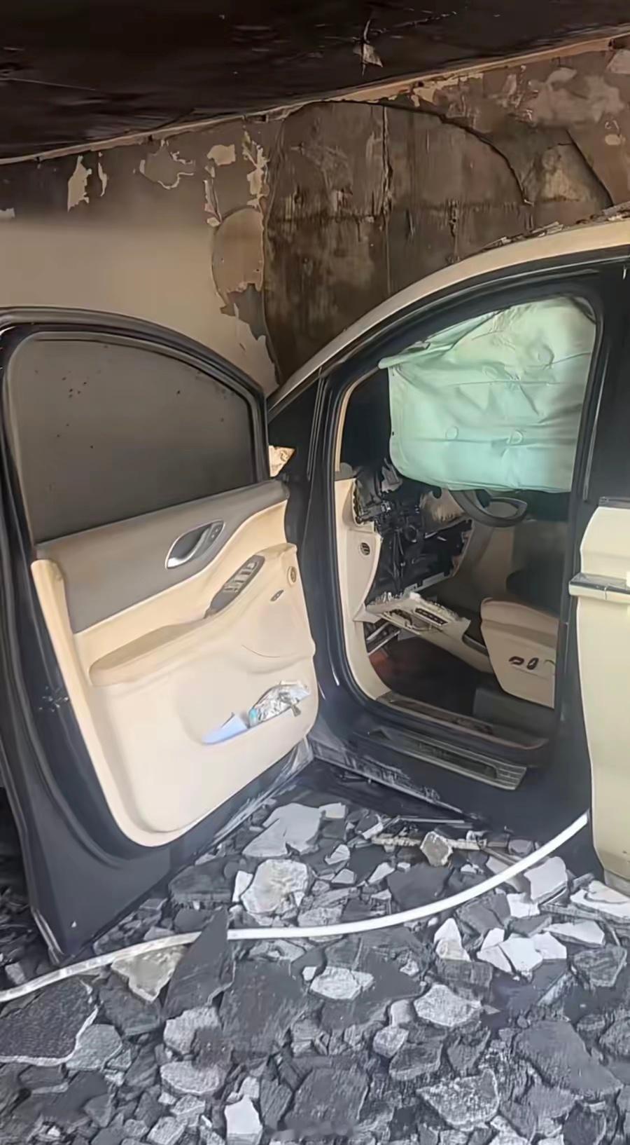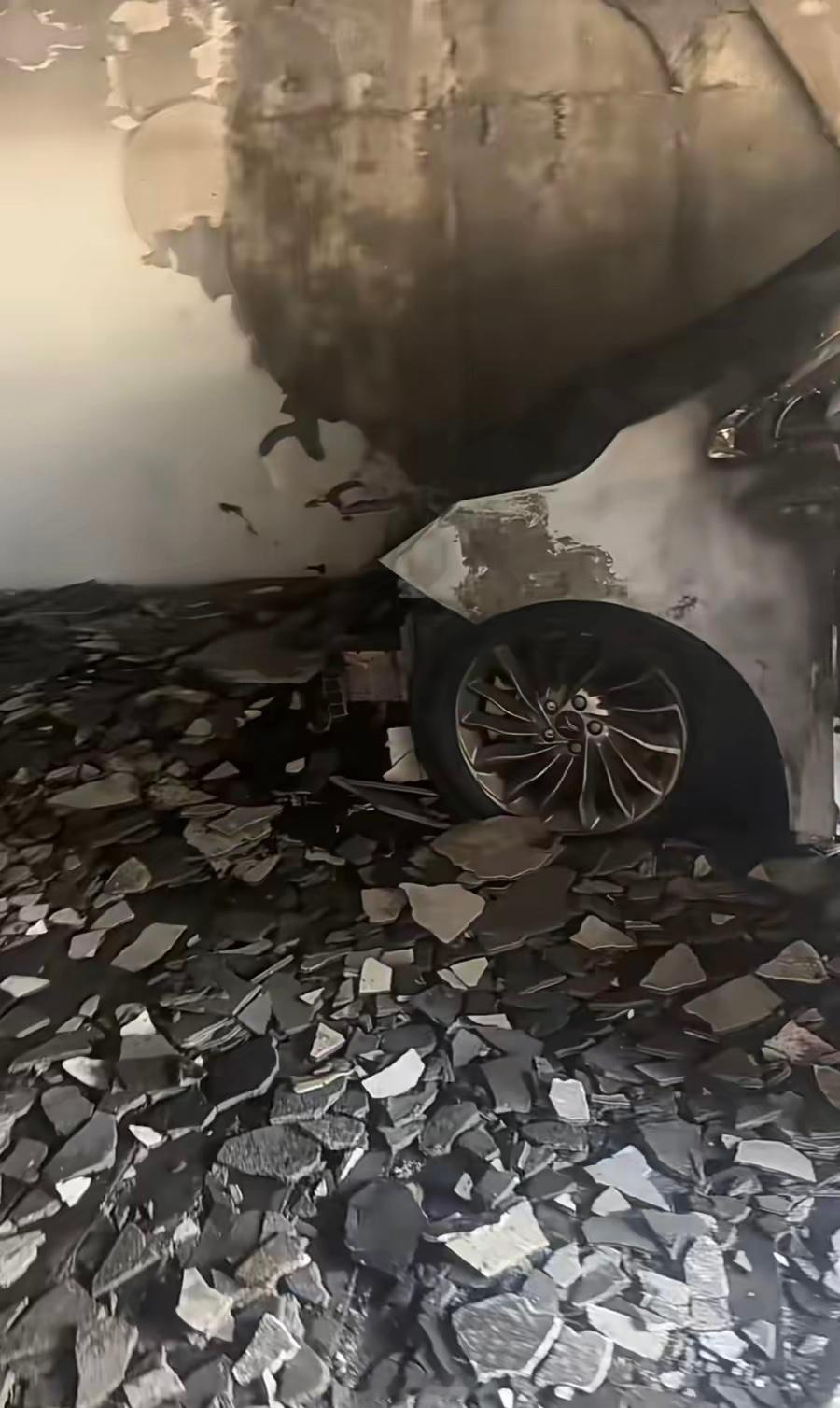 有市民看到,起火车辆的车头烧毁,车辆侧边安全气囊弹出,地库入口处散落着碎石,现场一片狼藉。
