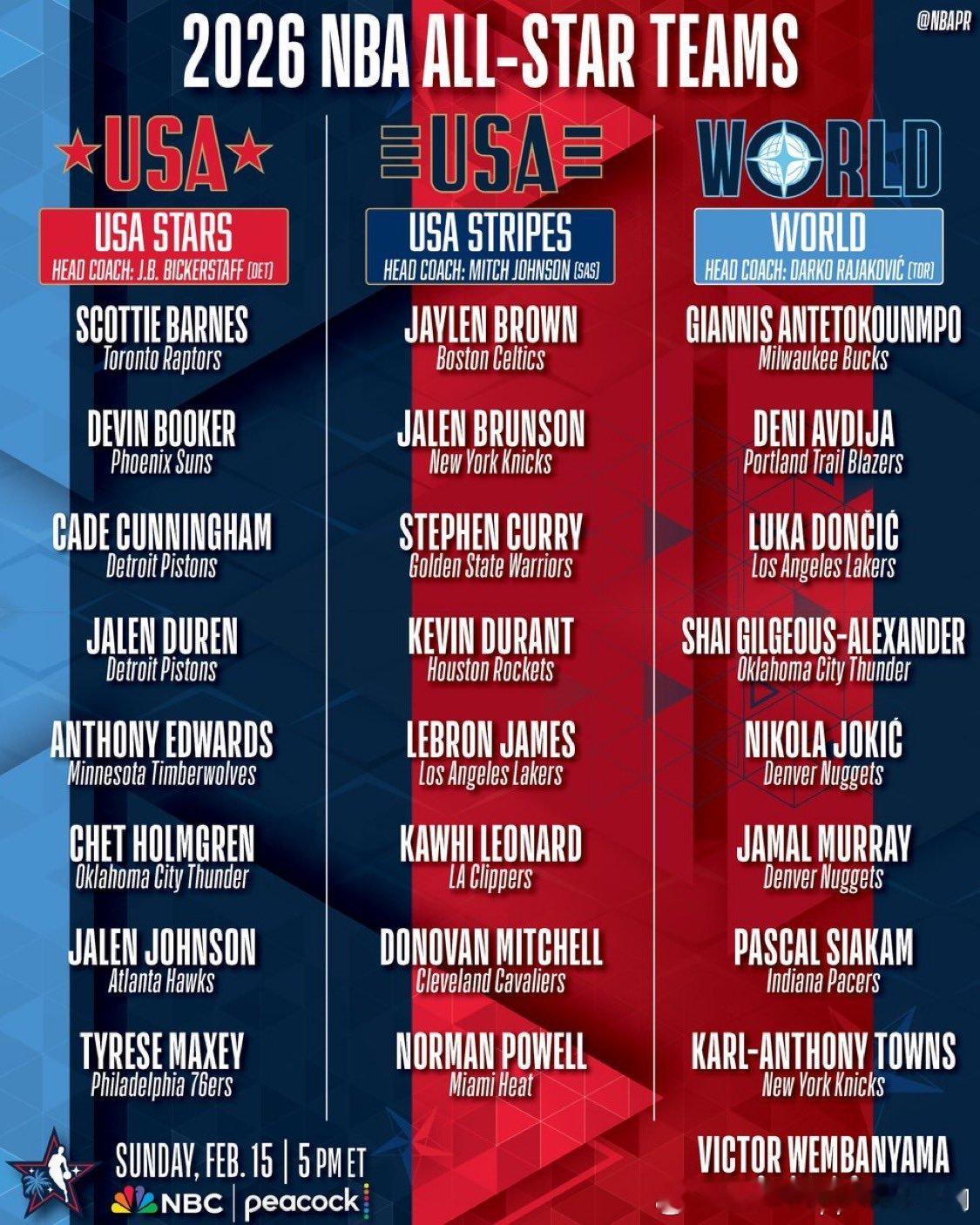 卡子哥递补入选全明星了,唐斯估计会代表世界队,卡子代表美国…申老师彻底无缘全明星
