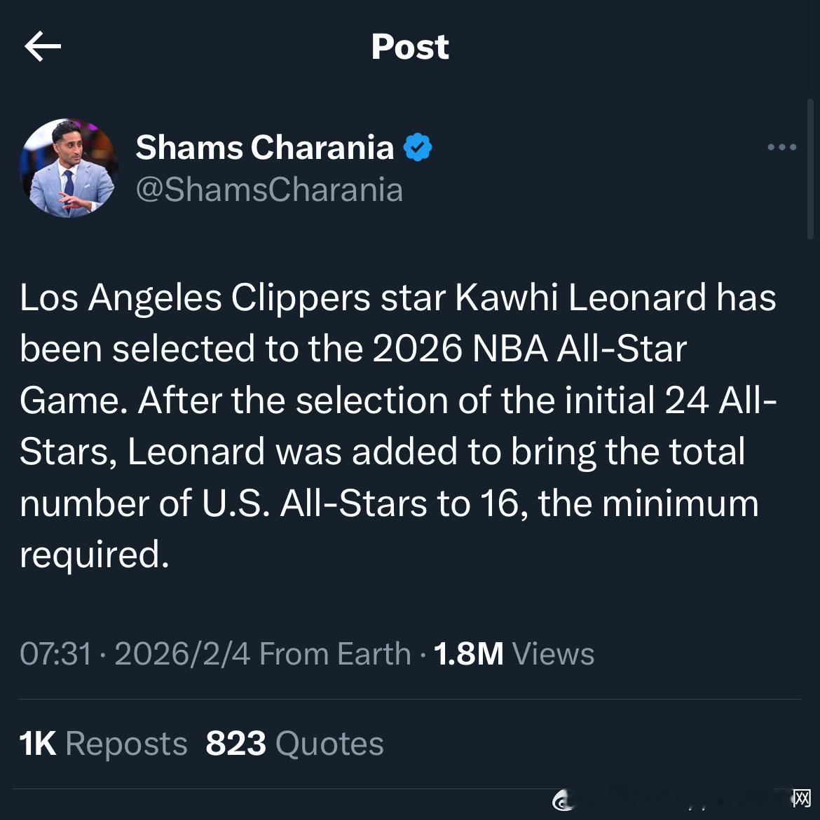Shams: 卡哇伊莱昂纳德被选入全明星顶替受伤的字母哥,小卡加入美国队,唐斯会