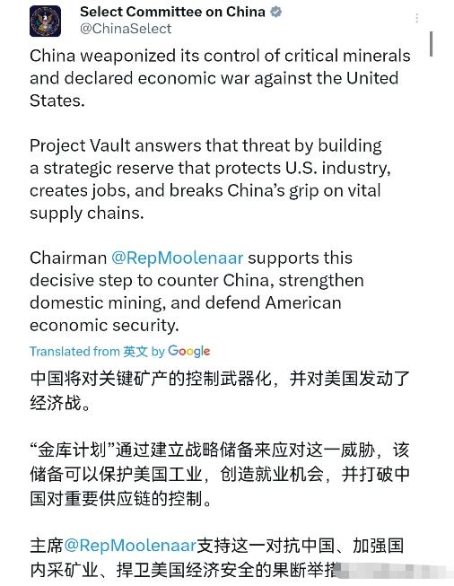 美国众议院中国问题特别委员会对我们进行警告!2月4日,该委员会声称,中国将其对关键矿产的控制武器化,并对美国发动了“经济战”。“金库计划”通过建立战略储备来应对这一威胁,该储备既能保护美国产业、创造就业岗位,也能打破中国对关键供应链的掌控。 委员会主席穆勒纳尔支持这一果断举措,以对抗中国、加强本土采矿产业,并捍卫美国的经济安全。很显然,美国政客的这一说辞,可以说是典型的倒打一耙。就按照美国政客这种逻辑,说我们对美国发动了“经济战”,那请问中国为什么要对美国发动“经济战”呢? 美国推出“金库计划”,说要建战略储备来打破中国对供应链的掌控。想法听起来挺美,但实际操作起来可没那么容易。 美国国内采矿产业面临着很多问题,比如环保法规严格、审批时间长、成本高等。像亚利桑那州的Resolution铜矿,从发现到现在已经26年了,还没开始生产。而且美国的盟友也不一定能完全替代中国的作用。 澳大利亚虽然和美国签了85亿美元的关键矿产协议,但澳大利亚的稀土加工能力还很弱,大部分稀土矿还是要运到中国加工。美国想通过盟友来摆脱对中国的依赖,短期内恐怕很难实现。 中国在关键矿产领域的政策,其实主要是出于自身发展和环境保护的考虑。中国是全球最大的稀土生产国,但稀土开采和加工会对环境造成很大影响。 为了保护生态环境,中国近年来加强了对稀土开采的管理,限制了一些高污染、高能耗的产能。 这是合理合法的举措,其他国家也有类似的做法。比如美国,为了保护本土环境,很多矿山都处于关闭状态。 美国把中国的正常产业政策说成是“经济战”,其实是在为自己的霸权主义找借口。美国一直想在关键矿产领域保持主导地位,对中国的发展感到恐慌。于是就通过各种手段打压中国,试图遏制中国的崛起。这种做法不仅违背了市场经济原则,也破坏了全球产业链的稳定。 中国一直主张在平等互利的基础上开展国际合作,愿意与各国分享关键矿产领域的发展机遇。 中国推动“一带一路”倡议,在沿线国家投资建设了很多矿产项目,促进了当地经济的发展。中国还积极参与全球关键矿产治理,推动建立公平合理的国际规则。 美国的“经济战”指控完全是无稽之谈。中国对关键矿产的控制,是基于自身发展和环境保护的需要,是正常的产业政策。 美国应该正视自己在关键矿产领域的问题,而不是把责任推给中国。只有通过合作,才能实现共赢,而不是搞对抗。 美国的“金库计划”也不可能打破中国对供应链的掌控,因为中国在关键矿产领域的优势是长期积累的结果,不是短期内就能被取代的。希望美国能摒弃冷战思维,与中国一道,为全球产业链的稳定和发展做出贡献。