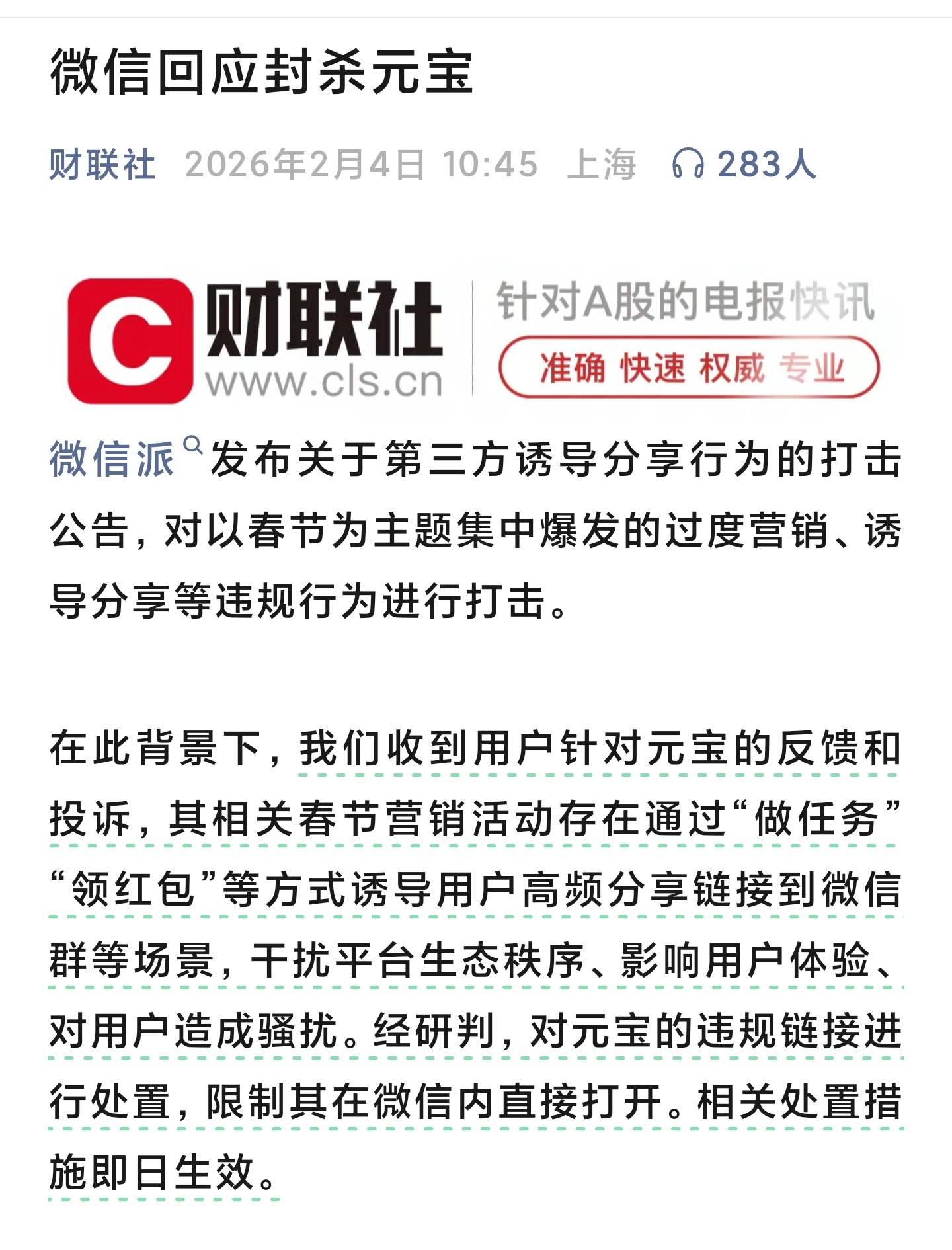 元宝负责人连夜找到张小龙说:配合表演一下 ,不然真得发10亿。微信屏蔽元宝红包链接