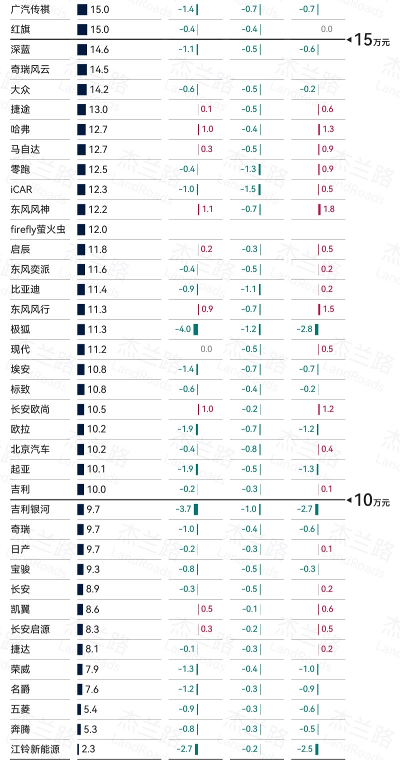 红旗品牌均价只有15万,和广汽传祺一样,看看谁还会把红旗归位豪华品牌?零跑均价12.5万,吉利和吉利银河的均价非常低,只有10、9.7万。