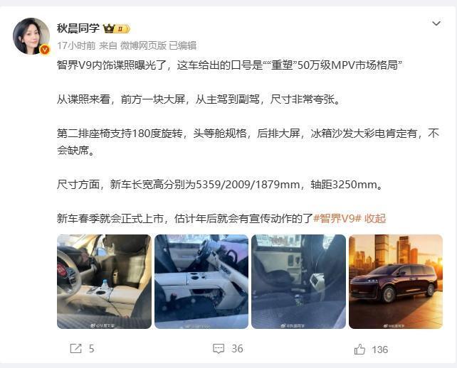 赵长江刚换赛道,智界V9就亮大招 从内饰谍照来看,前排三联屏直接铺满,二排座椅竟然支持180度旋转[惊呆] 再配上华为ADS 4和鸿蒙座舱5,这妥妥是把头等舱搬进了车里。 2025年问界卖了42万辆,但全是SUV。 2026年,智界V9承载了鸿蒙智行切入50万级高端商用市场的重任。 赵长江的加盟,补齐了智界在MPV营销和用户运营上的短板。 这波杀伤力不言而喻[吃瓜群众]