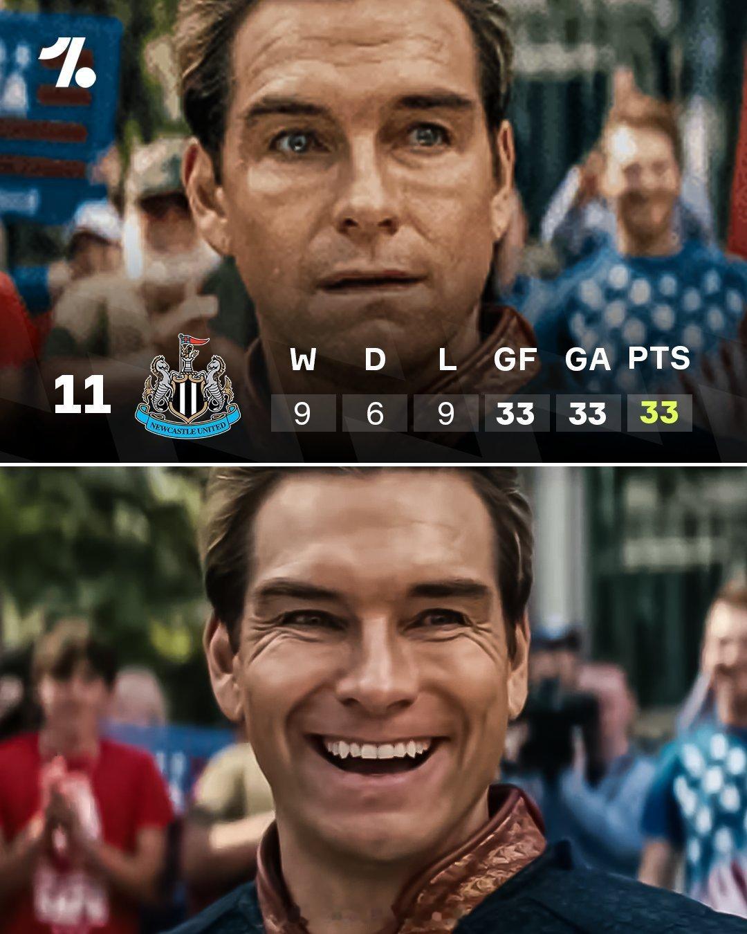 【绝对平衡】英超24轮过后,纽卡斯尔联以9胜6平9负的战绩,排名第11位。进33球,失33球,积33分。