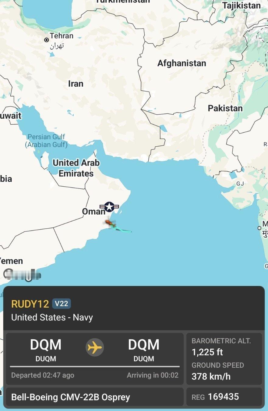 今天,一架 CMV-22B 型“鱼鹰”直升机被追踪到从该航母起飞,并朝着阿曼海岸附近的一个基地飞去。何天恩